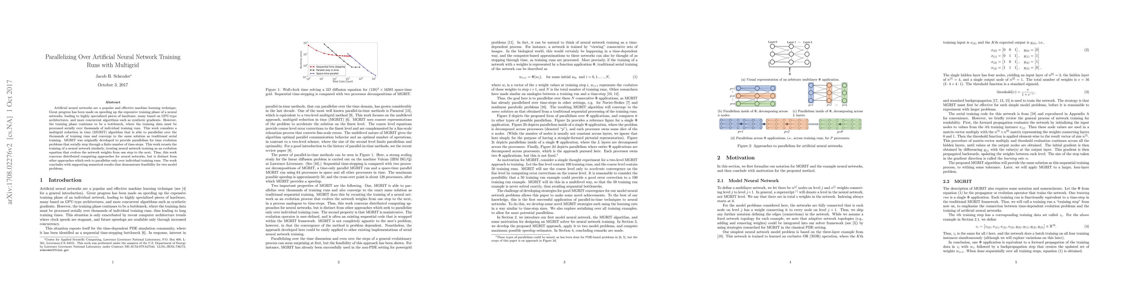 This paper proposes a multigrid reduction in time (MGRIT) algorithm to parallelize neural network training across multiple runs, achieving the same solution as traditional methods but with distributed computing. Numerical results demonstrate the effectiveness of this approach for two model problems.