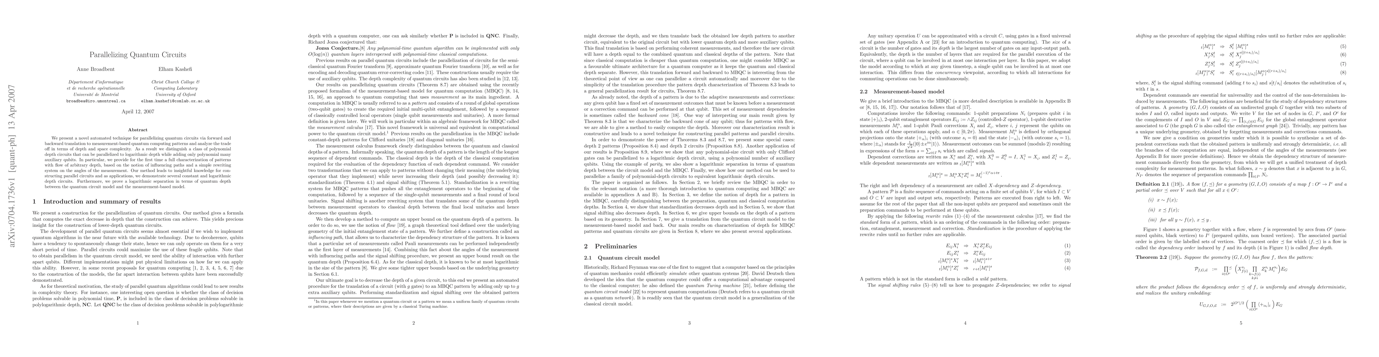 We present a novel automated technique for parallelizing quantum circuits via forward and backward translation to measurement-based quantum computing patterns and analyze the trade off in terms of depth and space complexity. As a result we distinguish a class of polynomial depth circuits that can be parallelized to logarithmic depth while adding only polynomial many auxiliary qubits. In particular, we provide for the first time a full characterization of patterns with flow of arbitrary depth, based on the notion of influencing paths and a simple rewriting system on the angles of the measurement. Our method leads to insightful knowledge for constructing parallel circuits and as applications, we demonstrate several constant and logarithmic depth circuits. Furthermore, we prove a logarithmic separation in terms of quantum depth between the quantum circuit model and the measurement-based model.