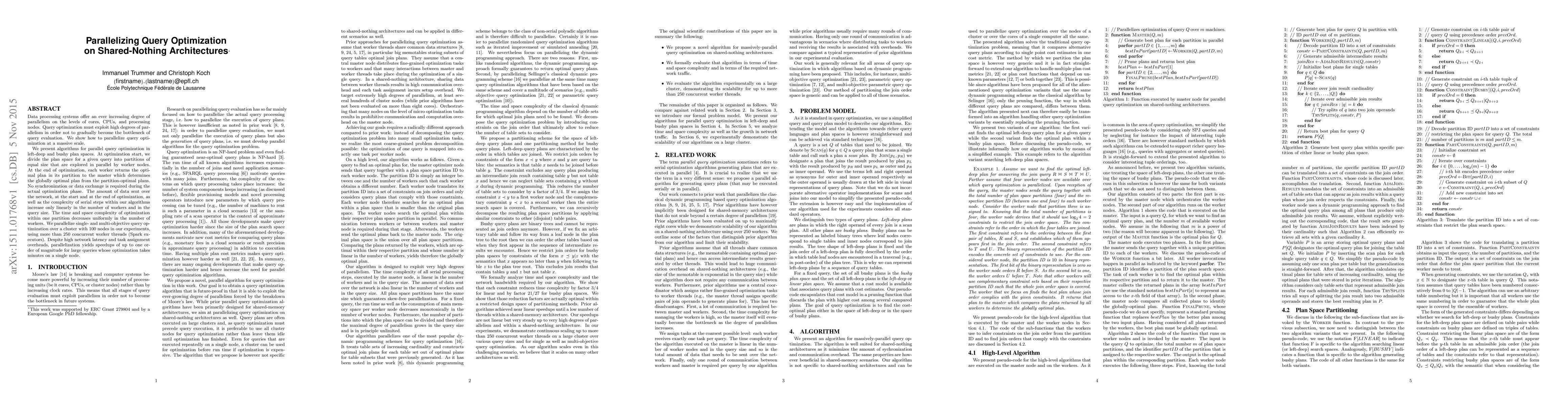 Data processing systems offer an ever increasing degree of parallelism on the levels of cores, CPUs, and processing nodes. Query optimization must exploit high degrees of parallelism in order not to gradually become the bottleneck of query evaluation. We show how to parallelize query optimization at a massive scale. We present algorithms for parallel query optimization in left-deep and bushy plan spaces. At optimization start, we divide the plan space for a given query into partitions of equal size that are explored in parallel by worker nodes. At the end of optimization, each worker returns the optimal plan in its partition to the master which determines the globally optimal plan from the partition-optimal plans. No synchronization or data exchange is required during the actual optimization phase. The amount of data sent over the network, at the start and at the end of optimization, as well as the complexity of serial steps within our algorithms increase only linearly in the number of workers and in the query size. The time and space complexity of optimization within one partition decreases uniformly in the number of workers. We parallelize single- and multi-objective query optimization over a cluster with 100 nodes in our experiments, using more than 250 concurrent worker threads (Spark executors). Despite high network latency and task assignment overheads, parallelization yields speedups of up to one order of magnitude for large queries whose optimization takes minutes on a single node.