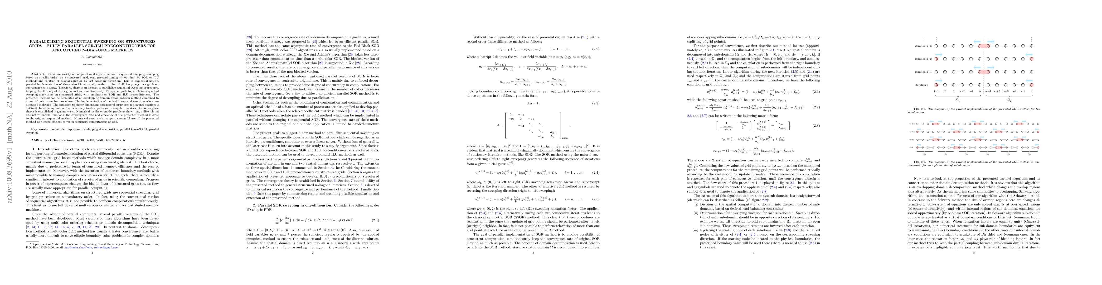 There are variety of computational algorithms need sequential sweeping; sweeping based on specific order; on a structured grid, e.g., preconditioning (smoothing) by SOR or ILU methods and solution of eikonal equation by fast sweeping algorithm. Due to sequential nature, parallel implementation of these algorithms usually leads to miss of efficiency; e.g. a significant convergence rate decay. Therefore, there is an interest to parallelize sequential sweeping procedures, keeping the efficiency of the original method simultaneously. This paper goals to parallelize sequential sweeping algorithms on structured grids, with emphasis on SOR and ILU preconditioners. The presented method can be accounted as an overlapping domain decomposition method combined to a multi-frontal sweeping procedure. The implementation of method in one and two dimensions are discussed in details. The extension to higher dimensions and general structured n-diagonal matrices is outlined. Introducing notion of alternatively block upper-lower triangular matrices, the convergence theory is established in general cases. Numerical results on model problems show that, unlike related alternative parallel methods, the convergence rate and efficiency of the presented method is close to the original sequential method. Numerical results also support successful use of the presented method as a cache efficient solver in sequential computations as well.