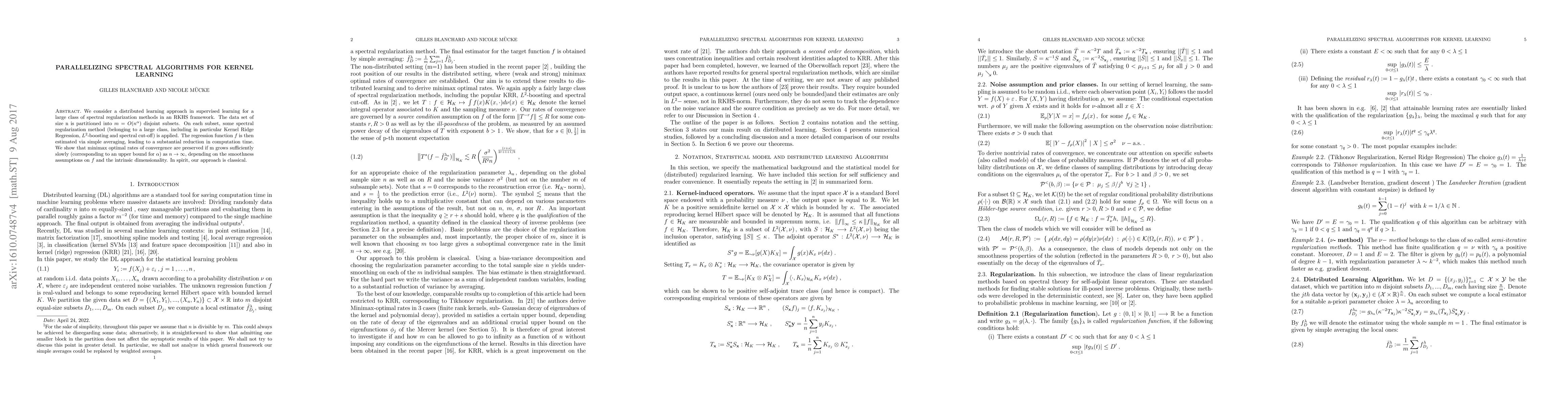 We consider a distributed learning approach in supervised learning for a large class of spectral regularization methods in an RKHS framework. The data set of size n is partitioned into $m=O(n^\alpha)$ disjoint subsets. On each subset, some spectral regularization method (belonging to a large class, including in particular Kernel Ridge Regression, $L^2$-boosting and spectral cut-off) is applied. The regression function $f$ is then estimated via simple averaging, leading to a substantial reduction in computation time. We show that minimax optimal rates of convergence are preserved if m grows sufficiently slowly (corresponding to an upper bound for $\alpha$) as $n \to \infty$, depending on the smoothness assumptions on $f$ and the intrinsic dimensionality. In spirit, our approach is classical.