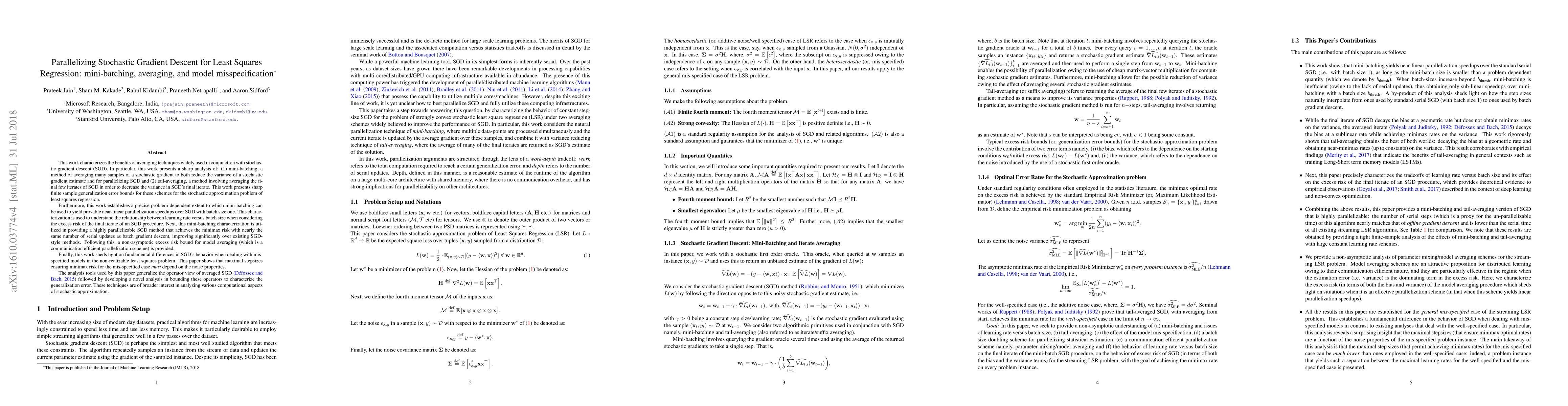 The paper characterizes benefits of averaging schemes used with stochastic gradient descent (SGD), providing non-asymptotic excess risk bounds for mini-batching and tail-averaging in least squares regression. It analyzes learning rate vs. batch size tradeoffs and presents a highly parallelizable SGD method.