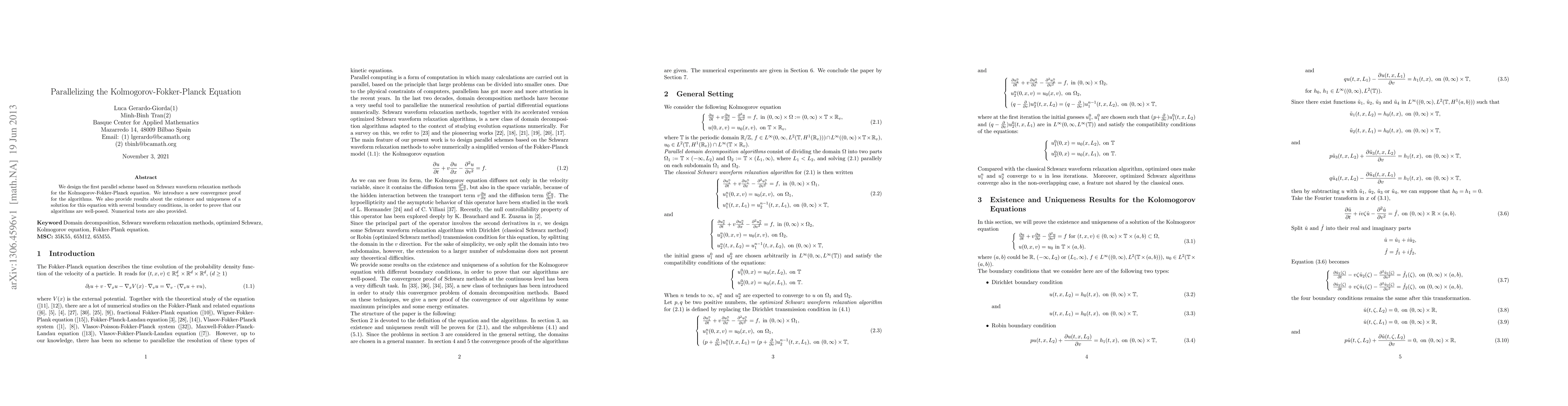 Researchers developed a parallel scheme for solving the Kolmogorov-Fokker-Planck equation using Schwarz waveform relaxation methods, with new convergence proof and results on existence and uniqueness of solutions.
