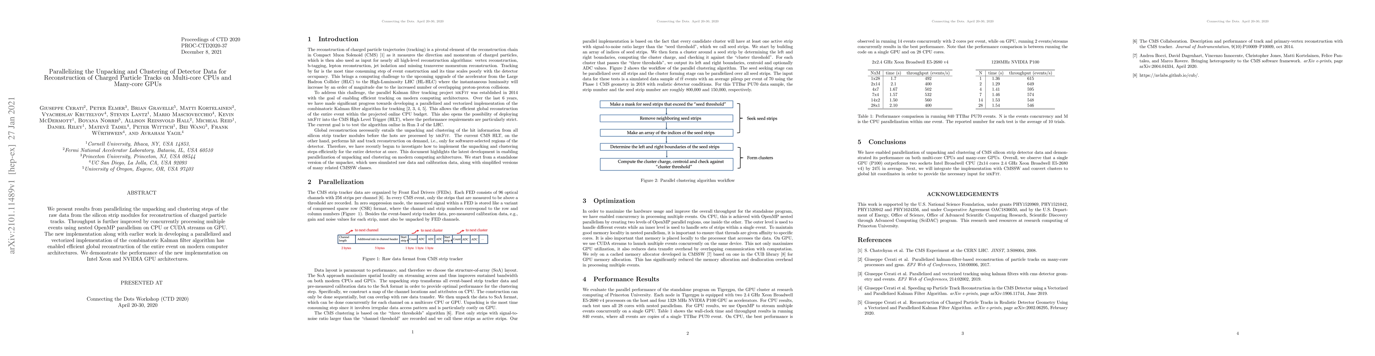 We present results from parallelizing the unpacking and clustering steps of the raw data from the silicon strip modules for reconstruction of charged particle tracks. Throughput is further improved by concurrently processing multiple events using nested OpenMP parallelism on CPU or CUDA streams on GPU. The new implementation along with earlier work in developing a parallelized and vectorized implementation of the combinatoric Kalman filter algorithm has enabled efficient global reconstruction of the entire event on modern computer architectures. We demonstrate the performance of the new implementation on Intel Xeon and NVIDIA GPU architectures.