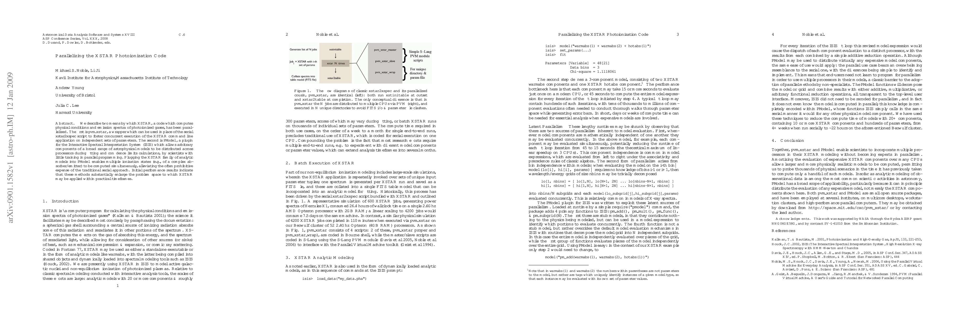 The XSTAR photoionization code has been parallelized using two methods: pvm_xstar for concurrent execution and PModel for distributed fitting calculations, allowing researchers to analyze complex astrophysical models more efficiently.