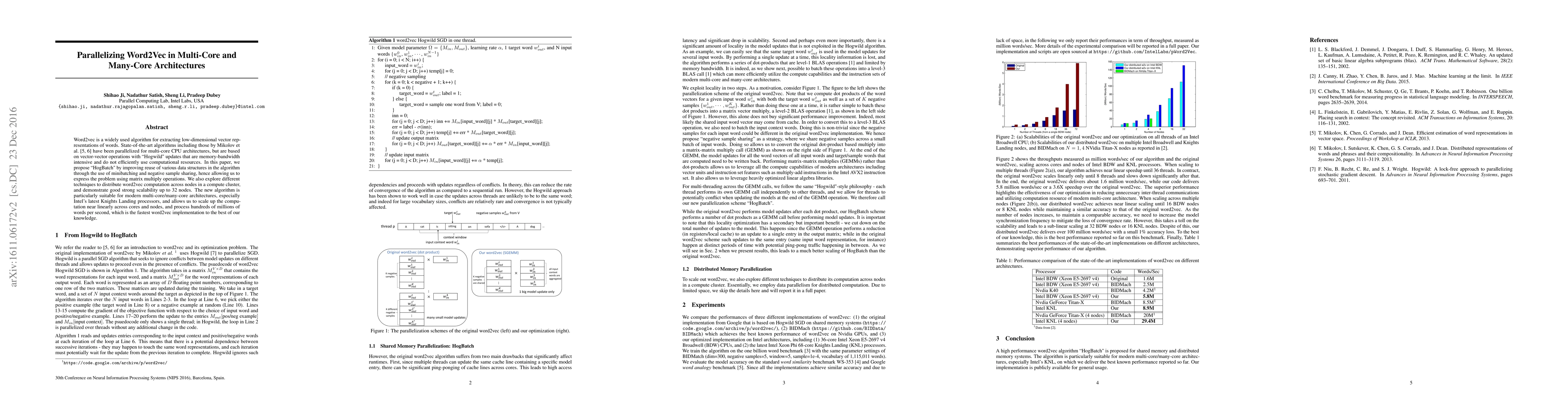 This paper proposes "HogBatch," a parallelized Word2Vec algorithm that enhances data structure reuse through minibatching and negative sample sharing, enabling efficient matrix multiply operations. The authors demonstrate strong scalability up to 32 nodes, achieving the fastest Word2Vec implementation on modern multi-core/many-core architectures, processing hundreds of millions of words per second.
