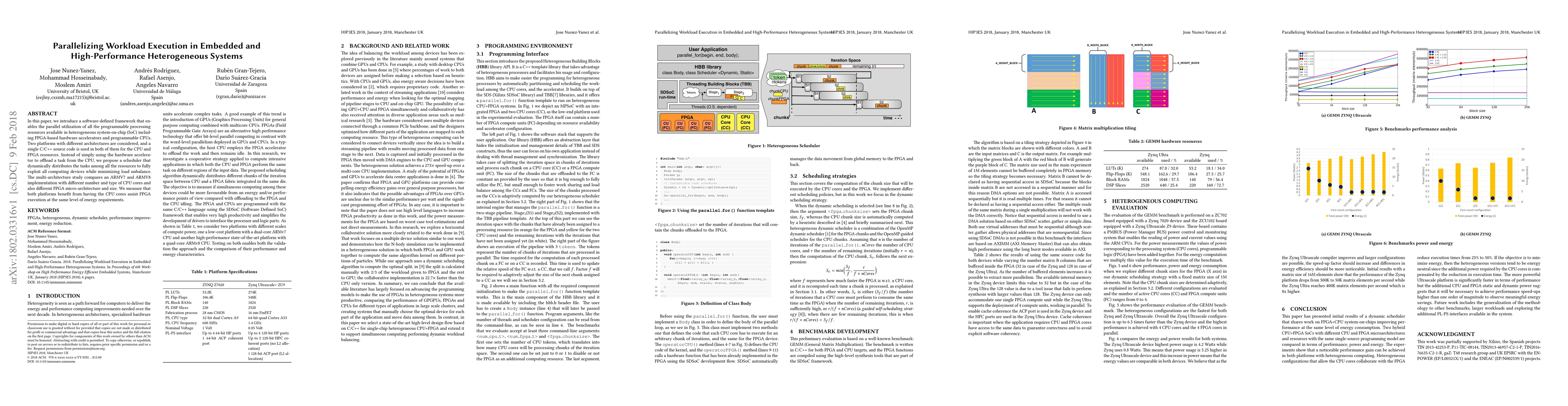 In this paper, we introduce a software-defined framework that enables the parallel utilization of all the programmable processing resources available in heterogeneous system-on-chip (SoC) including FPGA-based hardware accelerators and programmable CPUs. Two platforms with different architectures are considered, and a single C/C++ source code is used in both of them for the CPU and FPGA resources. Instead of simply using the hardware accelerator to offload a task from the CPU, we propose a scheduler that dynamically distributes the tasks among all the resources to fully exploit all computing devices while minimizing load unbalance. The multi-architecture study compares an ARMV7 and ARMV8 implementation with different number and type of CPU cores and also different FPGA micro-architecture and size. We measure that both platforms benefit from having the CPU cores assist FPGA execution at the same level of energy requirements.