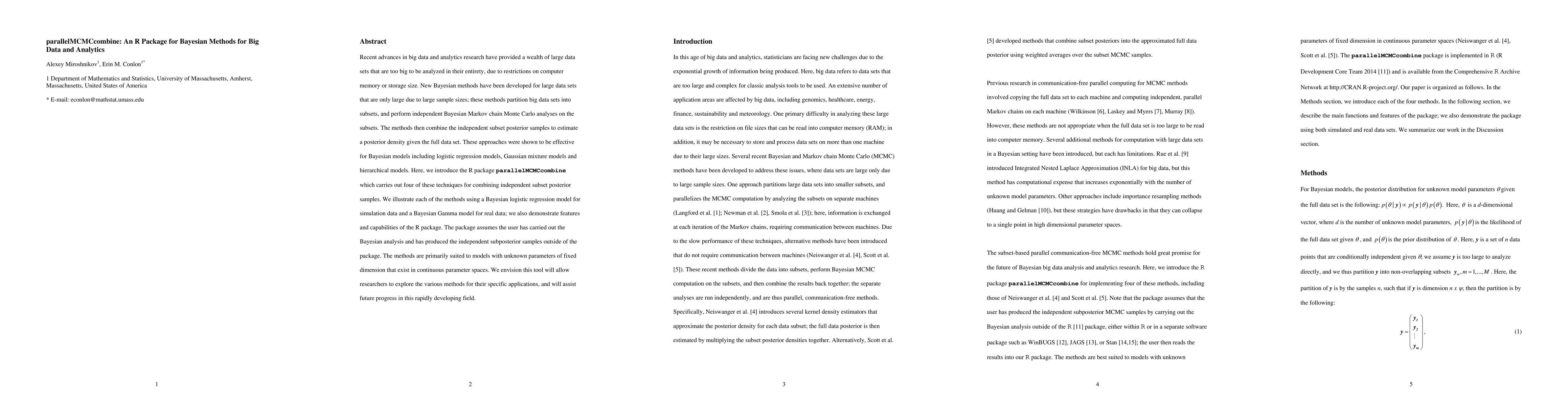The paper introduces the R package parallelMCMCcombine for Bayesian methods to analyze large data sets by partitioning them and combining independent subset posterior samples. The package implements four techniques for this purpose and is demonstrated using logistic regression and Gamma models.