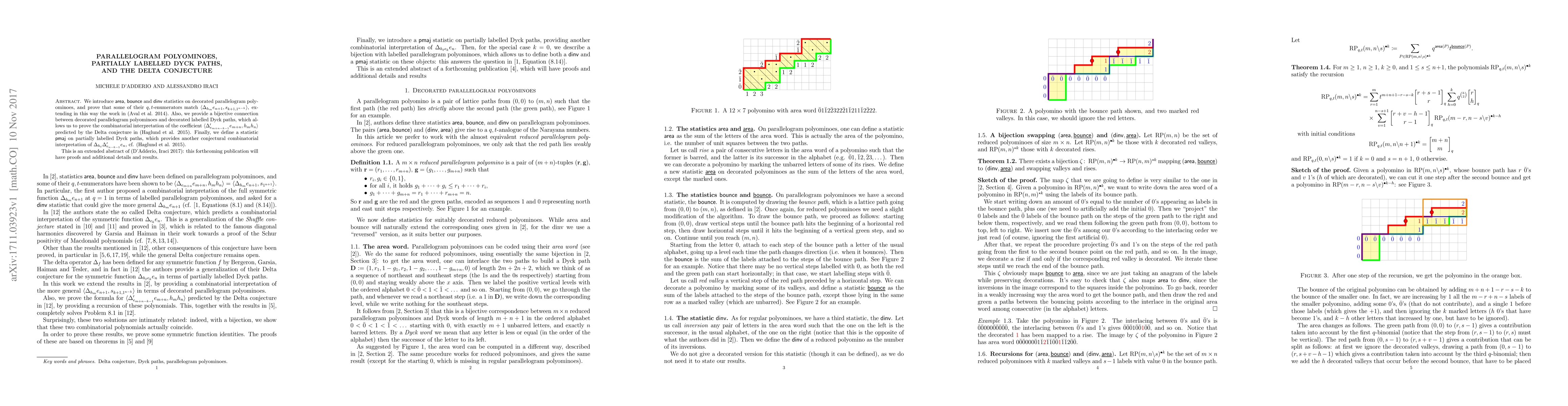 We introduce area, bounce and dinv statistics on decorated parallelogram polyominoes, and prove that some of their q,t-enumerators match $\langle \Delta_{h_m} e_{n+1}, s_{k+1,1^{n-k}} \rangle$, extending in this way the work in (Aval et al. 2014). Also, we provide a bijective connection between decorated parallelogram polyominoes and decorated labelled Dyck paths, which allows us to prove the combinatorial interpretation of the coefficient $\langle\Delta_{e_{m+n-k-1}}'e_{m+n}, h_m h_n \rangle$ predicted by the Delta conjecture in (Haglund et al. 2015). Finally, we define a statistic pmaj on partially labelled Dyck paths, which provides another conjectural combinatorial interpretation of $\Delta_{h_{\ell}}\Delta_{e_{n-k-1}}'e_n$, cf. (Haglund et al. 2015). This is an extended abstract of (D'Adderio, Iraci 2017): this forthcoming publication will have proofs and additional details and results.