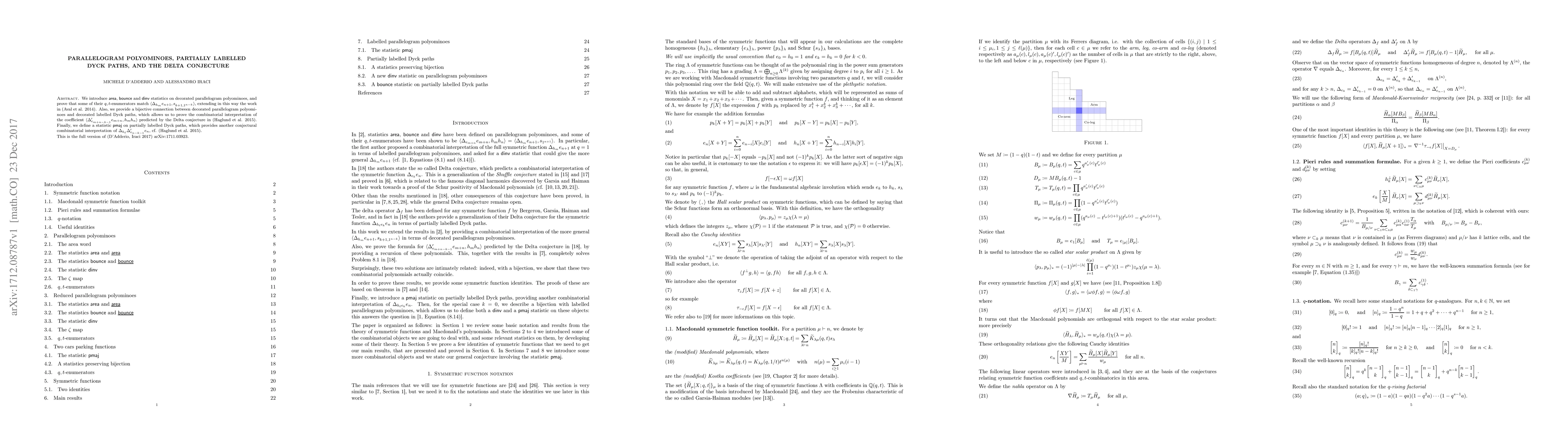 We introduce area, bounce and dinv statistics on decorated parallelogram polyominoes, and prove that some of their q,t-enumerators match $\langle \Delta_{h_m} e_{n+1},s_{k+1,1^{n-k}}\rangle$, extending in this way the work in (Aval et al. 2014). Also, we provide a bijective connection between decorated parallelogram polyominoes and decorated labelled Dyck paths, which allows us to prove the combinatorial interpretation of the coefficient $\langle \Delta_{e_{m+n-k-1}}'e_{m+n},h_m h_n\rangle$ predicted by the Delta conjecture in (Haglund et al. 2015). Finally, we define a statistic pmaj on partially labelled Dyck paths, which provides another conjectural combinatorial interpretation of $\Delta_{h_{\ell}}\Delta_{e_{n-k-1}}'e_n$, cf. (Haglund et al. 2015). This is the full version of (D'Adderio, Iraci 2017) arXiv:1711.03923.