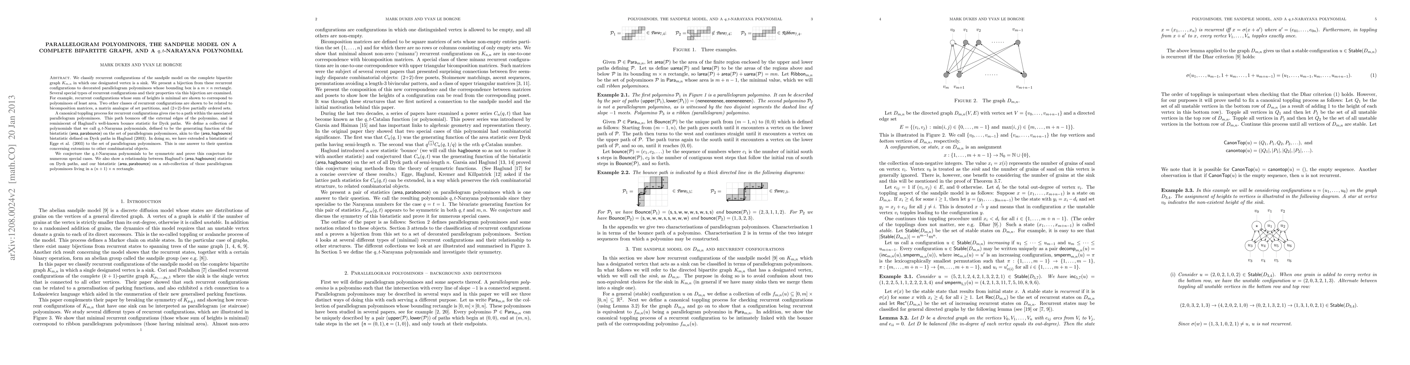 The introduction of q,t-Narayana polynomials and the bijection between recurrent sandpile configurations and parallelogram polyominoes.