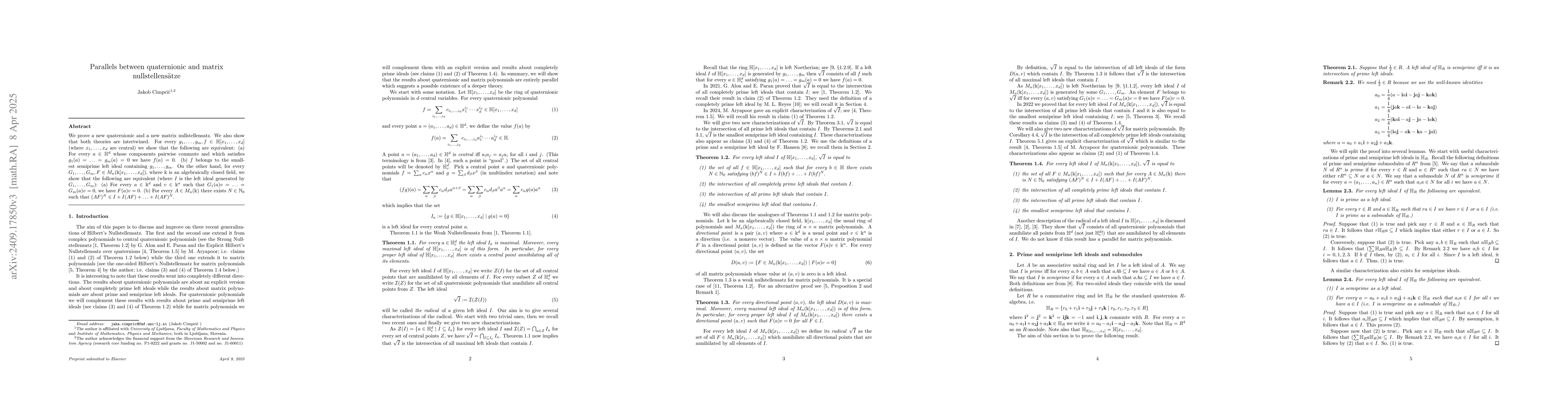 We prove a new quaternionic and a new matrix nullstellensatz. We also show that both theories are intertwined.