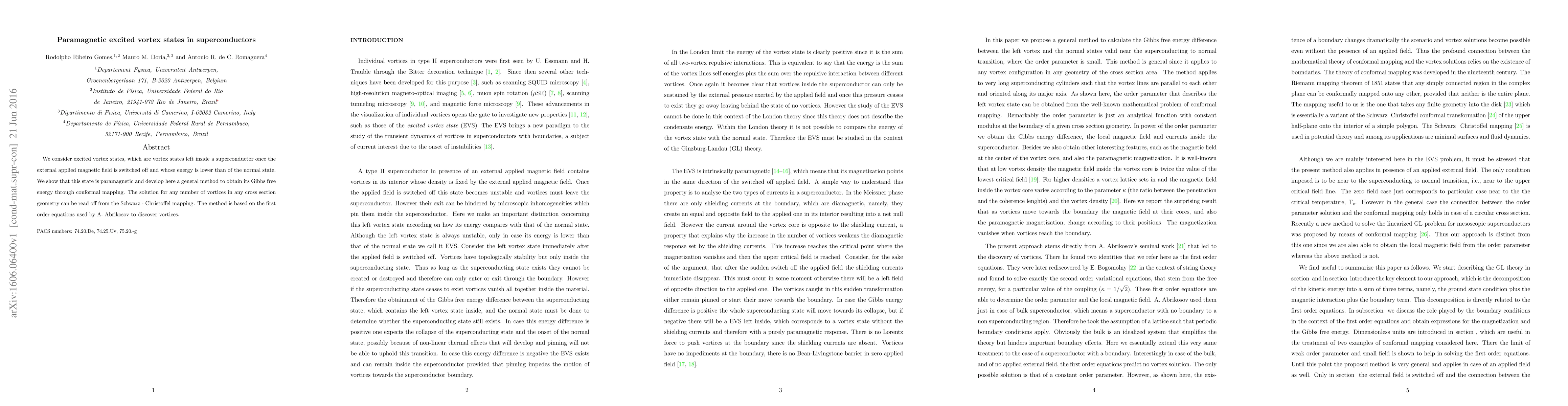 We consider excited vortex states, which are vortex states left inside a superconductor once the external applied magnetic field is switched off and whose energy is lower than of the normal state. We show that this state is paramagnetic and develop here a general method to obtain its Gibbs free energy through conformal mapping. The solution for any number of vortices in any cross section geometry can be read off from the Schwarz - Christoffel mapping. The method is based on the first order equations used by A. Abrikosov to discover vortices.