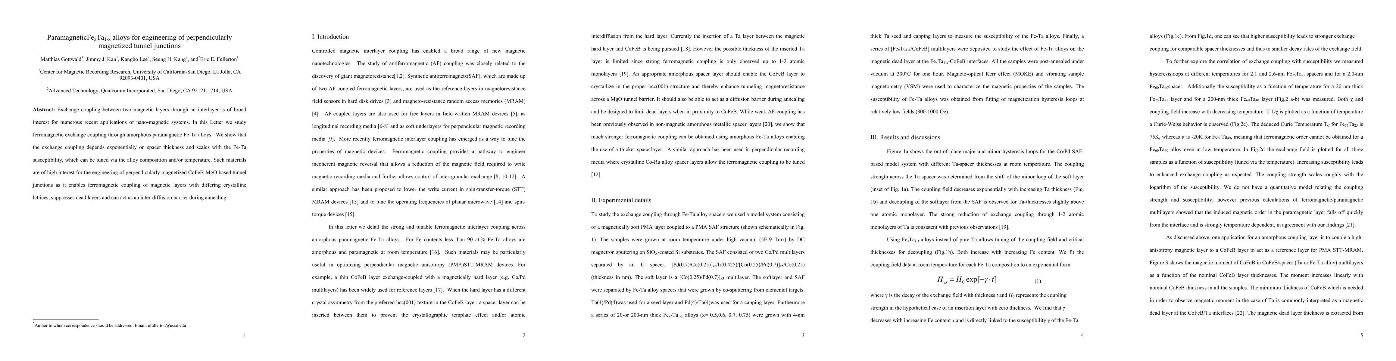 This research investigates ferromagnetic exchange coupling through amorphous paramagnetic Fe_xTa_{1-x} alloys, demonstrating that the coupling depends exponentially on spacer thickness and can be tuned via alloy composition or temperature. These materials are promising for engineering perpendicularly magnetized tunnel junctions, enabling ferromagnetic coupling across different lattices and serving as inter-diffusion barriers.