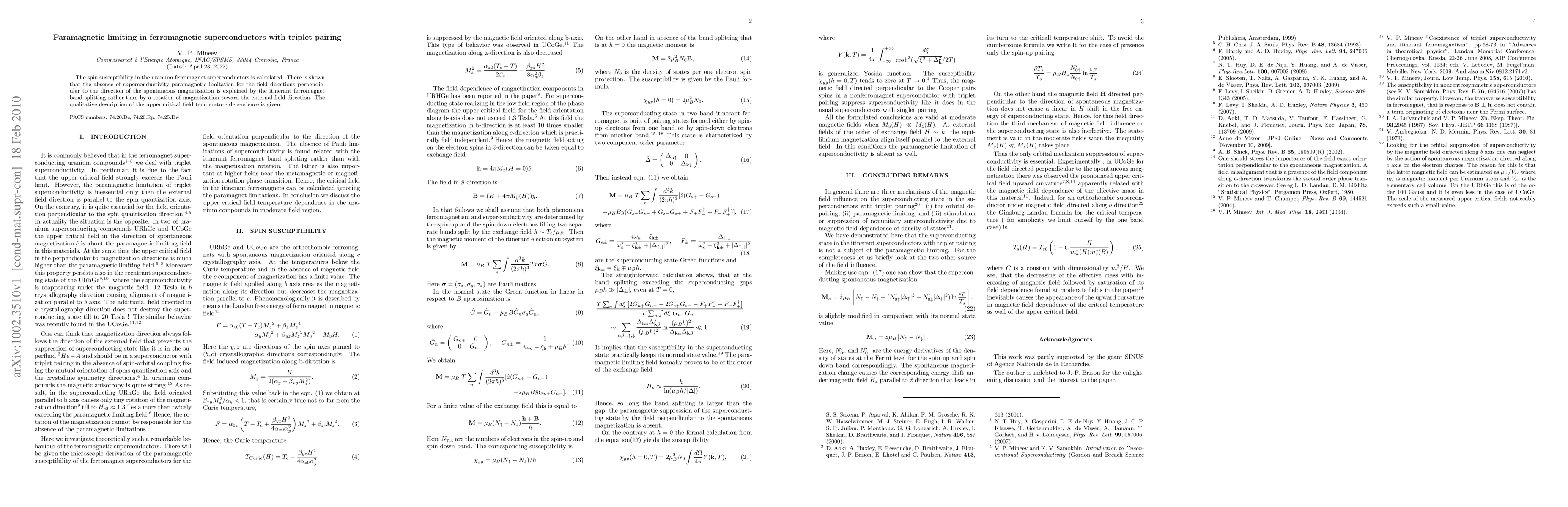 Researchers calculated spin susceptibility in uranium ferromagnet superconductors and found that itinerant band splitting explains paramagnetic limitation in the absence of superconductivity for fields perpendicular to spontaneous magnetization.