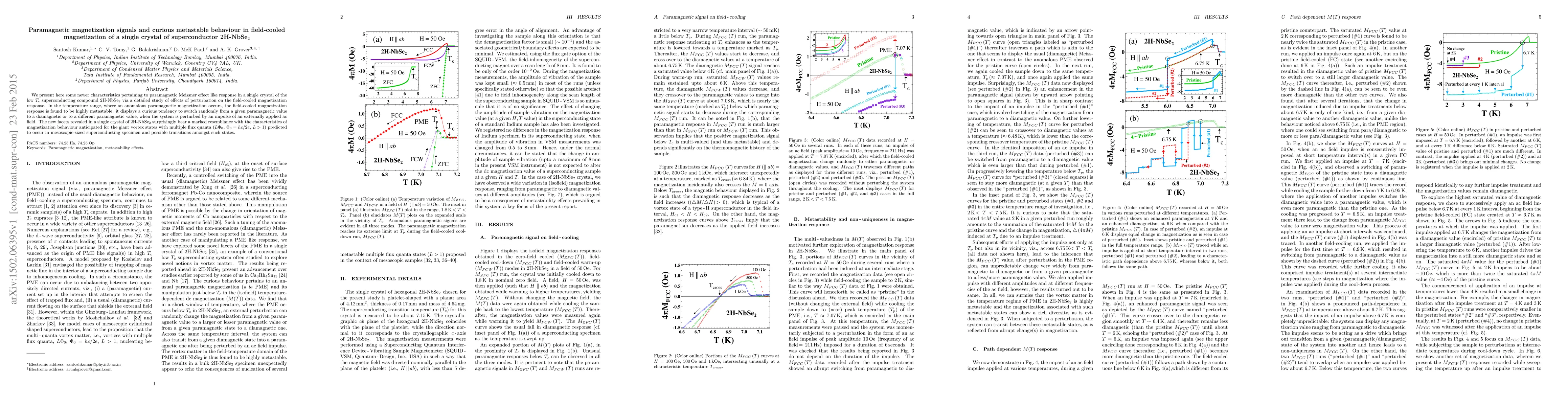 We present here some newer characteristics pertaining to paramagnetic Meissner effect like response in a single crystal of the low Tc superconducting compound 2H-NbSe2 via a detailed study of effects of perturbation on the field-cooled magnetization response. In the temperature range, where an anomalous paramagnetic magnetization occurs, the field-cooled magnetization response is found to be highly metastable: it displays a curious tendency to switch randomly from a given paramagnetic value to a diamagnetic or to a different paramagnetic value, when the system is perturbed by an impulse of an externally applied ac field. The new facets revealed in a single crystal of 2H-NbSe2 surprisingly bear a marked resemblance with the characteristics of magnetization behaviour anticipated for the giant vortex states with multiple flux quanta predicted to occur in mesoscopic-sized superconducting specimen and possible transitions amongst such states.