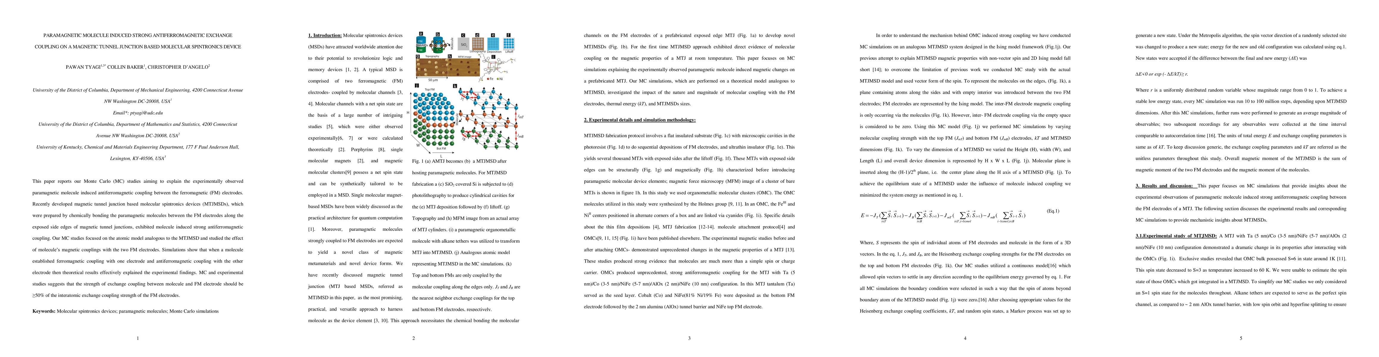 This paper reports Monte Carlo studies explaining paramagnetic molecule-induced antiferromagnetic coupling in magnetic tunnel junction based molecular spintronics devices, showing that strong coupling occurs when the molecule exhibits ferromagnetic coupling with one electrode and antiferromagnetic coupling with the other. The simulations suggest a 50% exchange coupling strength ratio between the molecule and ferromagnetic electrodes.
