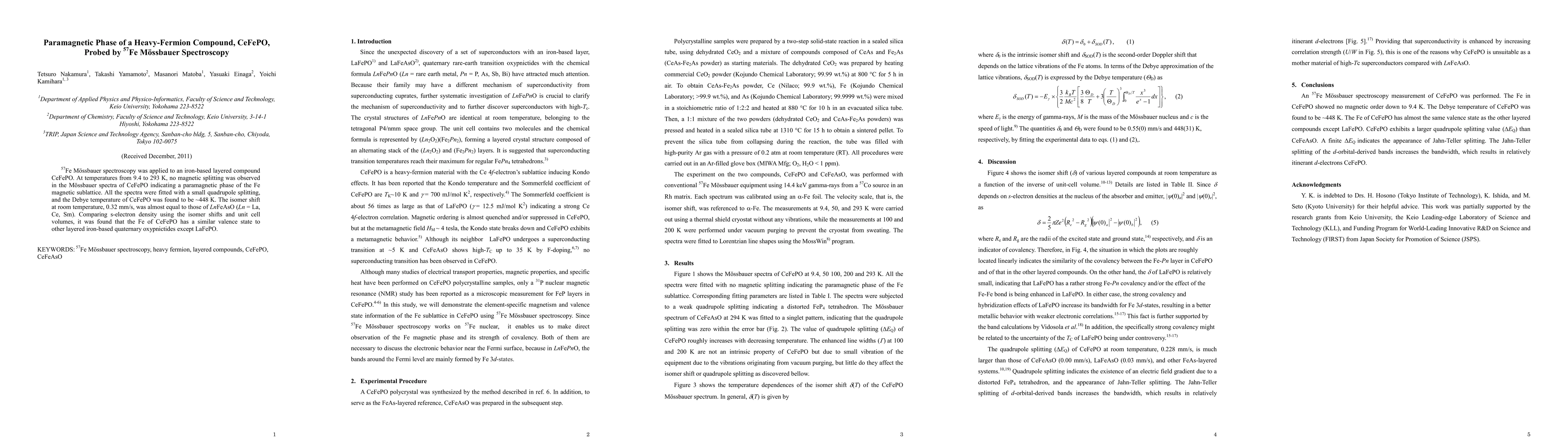 This study uses 57Fe Mössbauer spectroscopy to investigate CeFePO, revealing a paramagnetic phase of the Fe sublattice from 9.4 to 293 K with no magnetic splitting. The spectra indicate a Debye temperature of ~448 K and suggest Fe in CeFePO has a similar valence state to other iron-based oxypnictides.