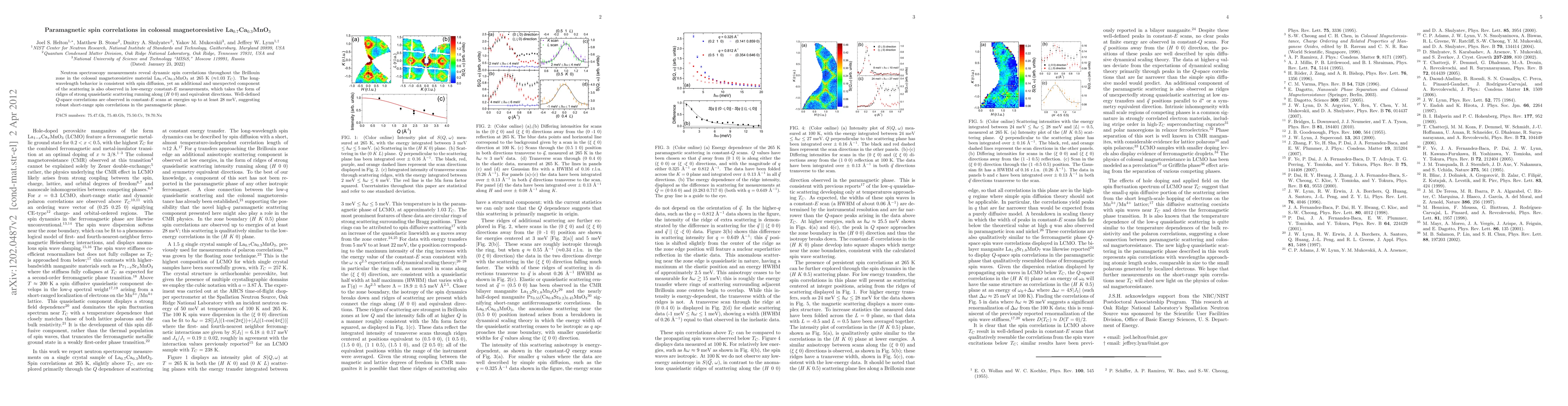 Neutron spectroscopy of La0.7Ca0.3MnO3 at 265 K (near 1.03 Tc) uncovers dynamic spin correlations across the Brillouin zone, indicating spin diffusion. Unexpectedly, additional quasielastic scattering ridges along (H 0 0) are observed, suggesting robust short-range spin correlations in the paramagnetic phase up to 28 meV.