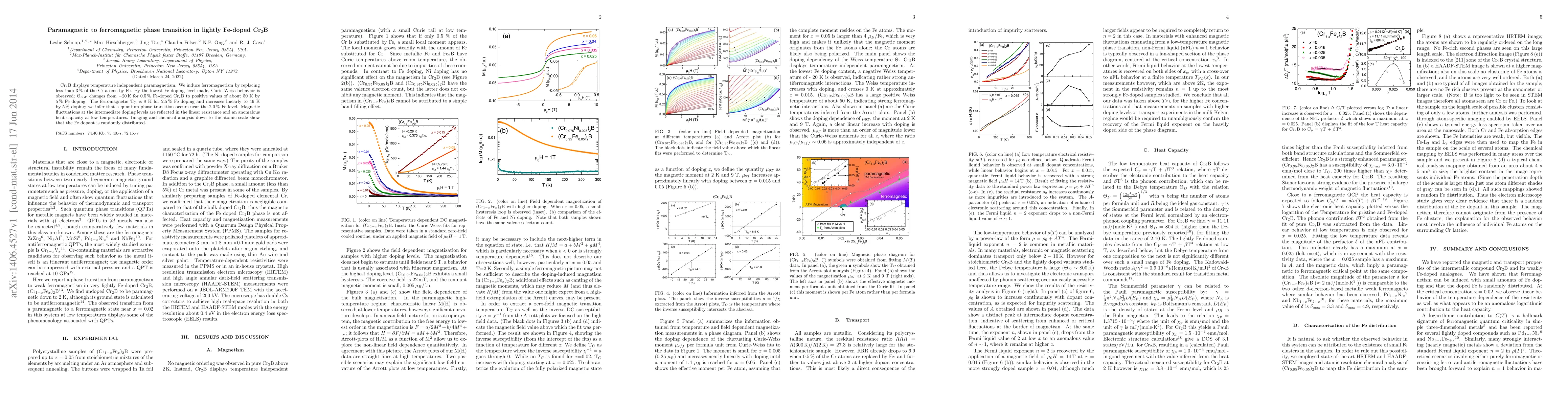 Cr$_2$B displays temperature independent paramagnetism. We induce ferromagnetism by replacing less than $3\,\%$ of the Cr atoms by Fe. By the lowest Fe doping level made, Curie-Weiss behavior is observed; $\Theta_{CW}$ changes from $-20\,$K for $0.5\,\%$ Fe-doped Cr$_2$B to positive values of about 50 K by $5\,\%$ Fe doping. The ferromagnetic T$_C$ is 8 K for $2.5\,\%$ Fe doping and increases linearly to 46 K by $5\,\%$ doping; we infer that a quantum phase transition occurs near the $2.0\,\%$ Fe level. Magnetic fluctuations at the intermediate doping levels are reflected in the linear resistance and an anomalous heat capacity at low temperatures. Imaging and chemical analysis down to the atomic scale show that the Fe dopant is randomly distributed.