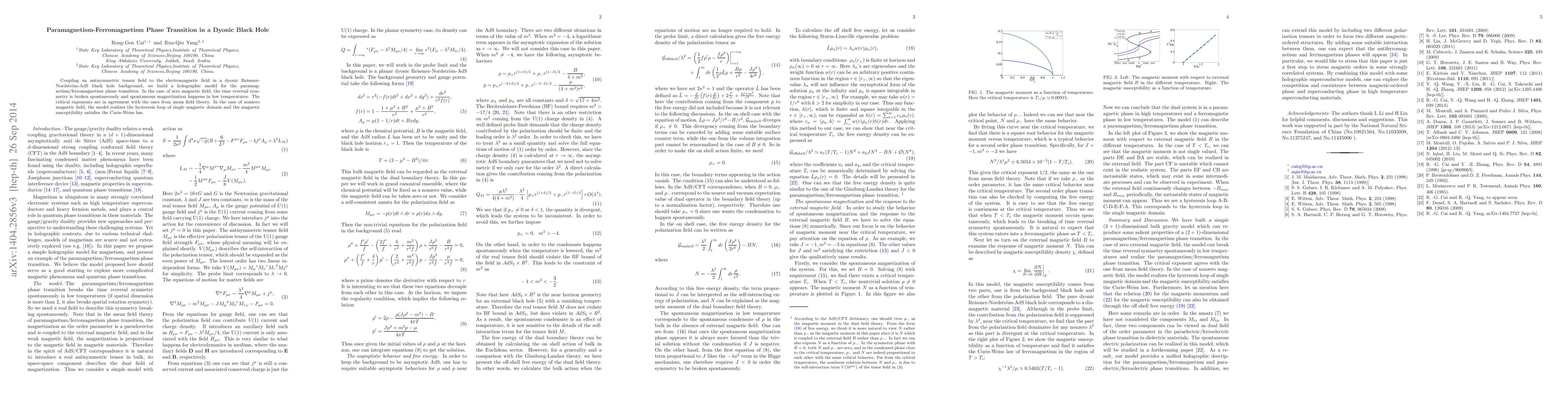 This research paper investigates a phase transition in a dyonic black hole model where spontaneous magnetization occurs at low temperatures, mimicking the behavior of paramagnetism or ferromagnetism in magnetic materials.