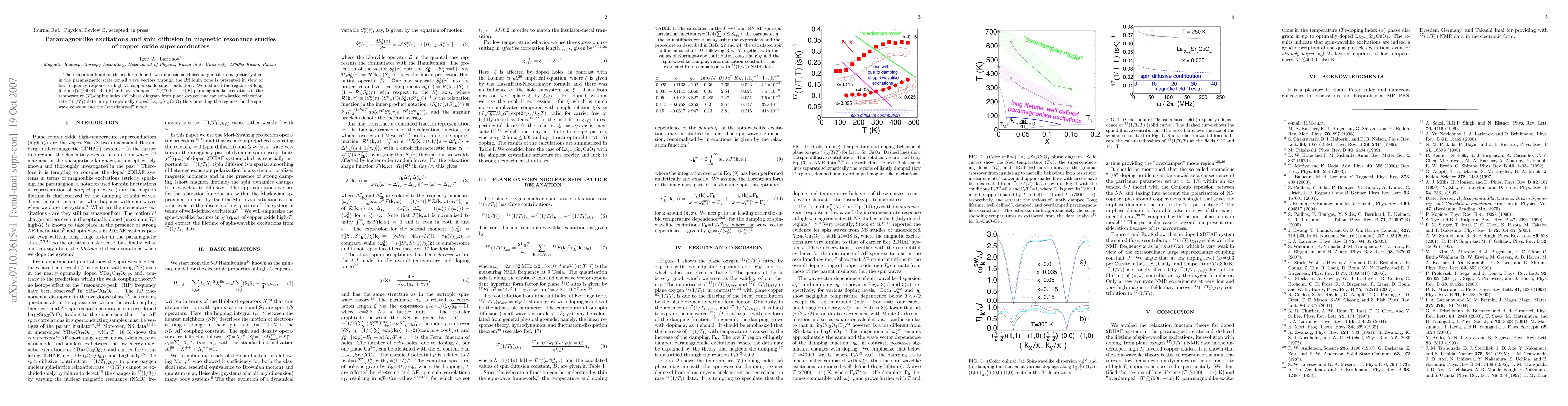 This paper presents a relaxation function theory for doped copper oxide superconductors, deducing regions of long-lived and overdamped paramagnonlike excitations in the temperature-doping phase diagram, based on nuclear spin-lattice relaxation data in La$_{2-x}$Sr$_{x}$CuO$_{4}$. The findings provide insights into spin diffusion and excitation dynamics in high-$T_c$ superconductors.