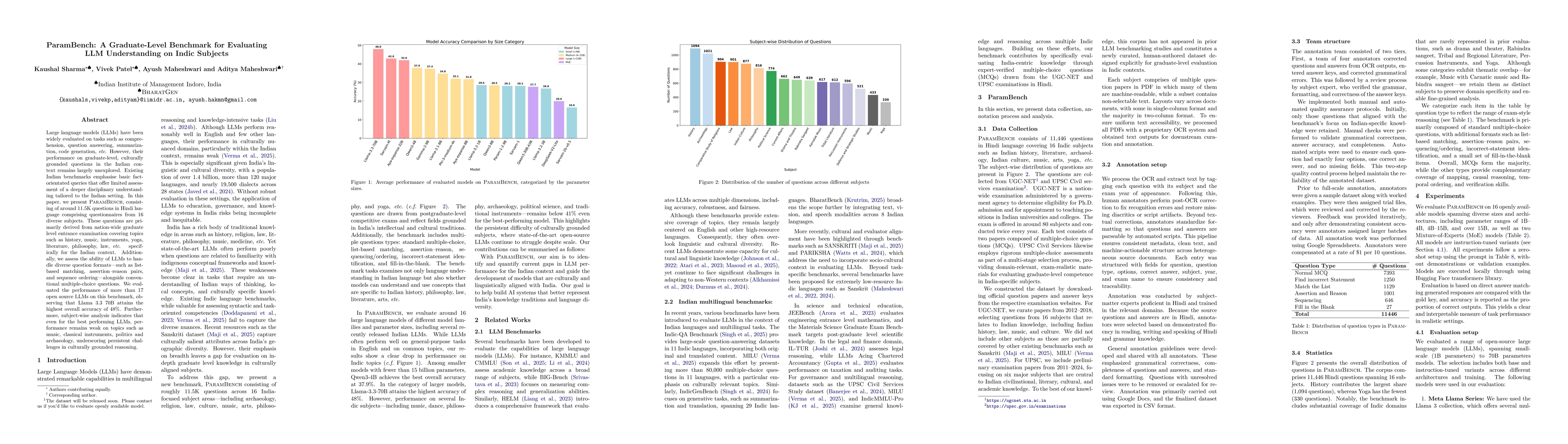 Large language models (LLMs) have been widely evaluated on tasks such as comprehension, question answering, summarization, code generation, etc. However, their performance on graduate-level, culturally grounded questions in the Indian context remains largely unexplored. Existing Indian benchmarks emphasise basic fact-orientated queries that offer limited assessment of a deeper disciplinary understanding tailored to the Indian setting. In this paper, we present ParamBench, consisting of around 11.5K questions in Hindi language comprising questionnaires from 16 diverse subjects. These questions are primarily derived from nation-wide graduate level entrance examination covering topics such as history, music, instruments, yoga, literature, philosophy, law, etc., specifically for the Indian context. Additionally, we assess the ability of LLMs to handle diverse question formats-such as list-based matching, assertion-reason pairs, and sequence ordering-alongside conventional multiple-choice questions. We evaluated the performance of more than 17 open source LLMs on this benchmark, observing that Llama 3.3 70B attains the highest overall accuracy of 48%. Furthermore, subject-wise analysis indicates that even for the best performing LLMs, performance remains weak on topics such as music, classical instruments, politics and archaeology, underscoring persistent challenges in culturally grounded reasoning.
