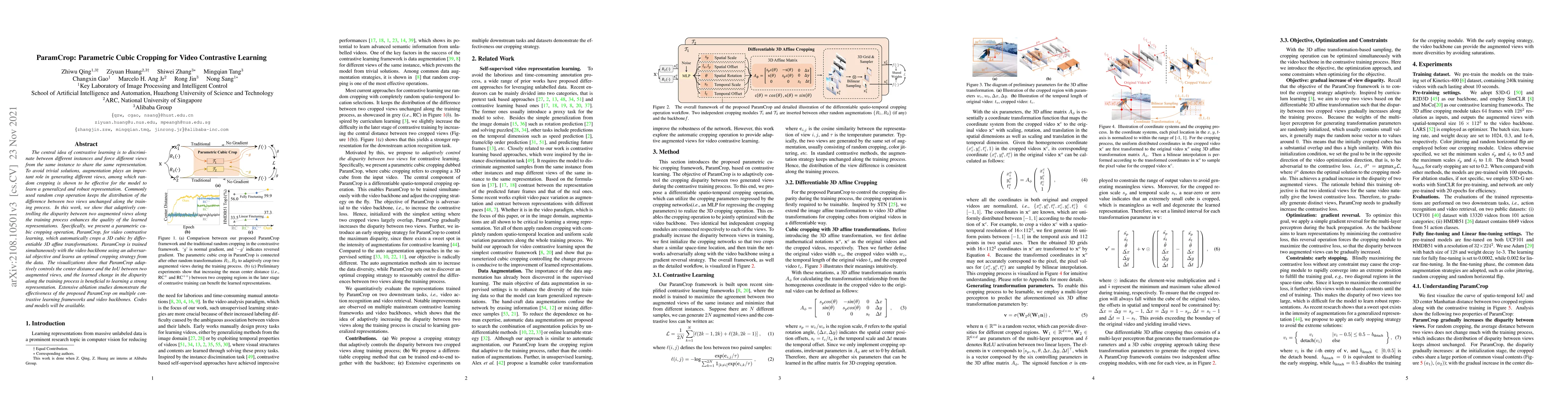ParamCrop proposes a parametric cubic cropping operation for video contrastive learning, which adaptsively controls disparity to learn strong representations. It enhances the quality of learned representations through an adversarial objective and beneficial change in disparity along training.