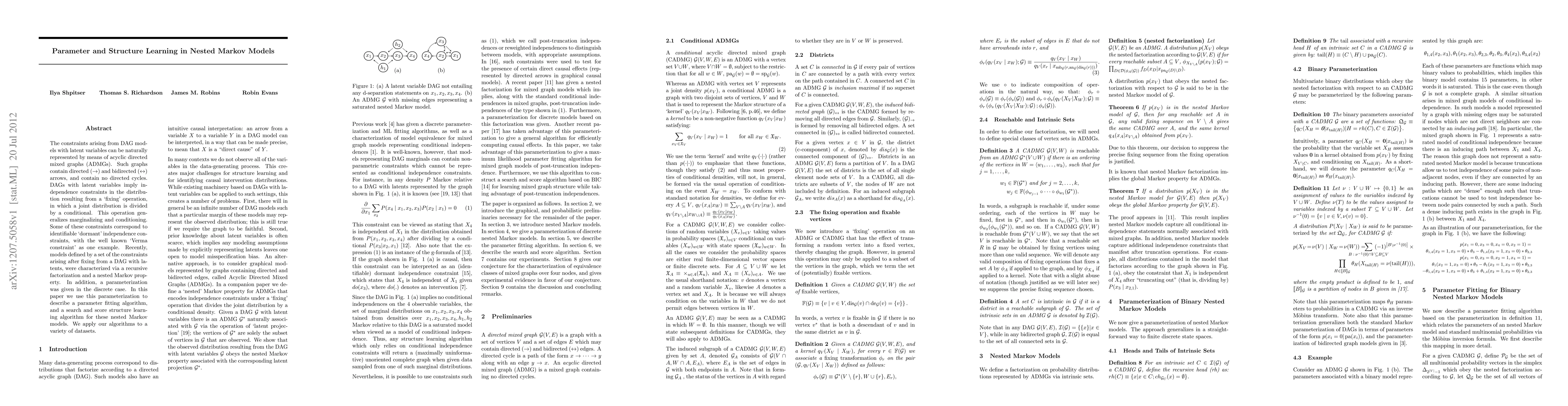 This paper introduces a parameter fitting algorithm and search algorithm for learning nested Markov models with latent variables, which can naturally represent constraints from DAGs with latent variables. The algorithms were applied to various datasets to demonstrate their effectiveness.