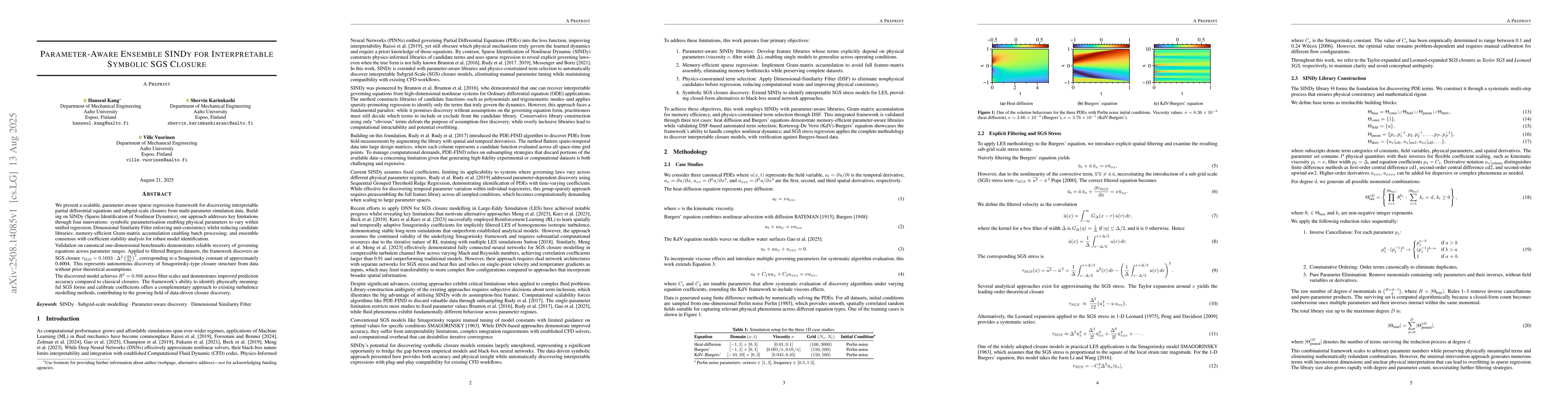 We present a scalable, parameter-aware sparse regression framework for discovering interpretable partial differential equations and subgrid-scale closures from multi-parameter simulation data. Building on SINDy (Sparse Identification of Nonlinear Dynamics), our approach addresses key limitations through four innovations: symbolic parameterisation enabling physical parameters to vary within unified regression; Dimensional Similarity Filter enforcing unit-consistency whilst reducing candidate libraries; memory-efficient Gram-matrix accumulation enabling batch processing; and ensemble consensus with coefficient stability analysis for robust model identification. Validation on canonical one-dimensional benchmarks demonstrates reliable recovery of governing equations across parameter ranges. Applied to filtered Burgers datasets, the framework discovers an SGS closure $\tau_{\mathrm{SGS}} = 0.1603\cdot\Delta^2\left(\frac{\partial \bar{u}}{\partial x}\right)^2$, corresponding to a Smagorinsky constant of approximately 0.4004. This represents autonomous discovery of Smagorinsky-type closure structure from data without prior theoretical assumptions. The discovered model achieves $R^2 = 0.886$ across filter scales and demonstrates improved prediction accuracy compared to classical closures. The framework's ability to identify physically meaningful SGS forms and calibrate coefficients offers a complementary approach to existing turbulence modelling methods, contributing to the growing field of data-driven closure discovery.