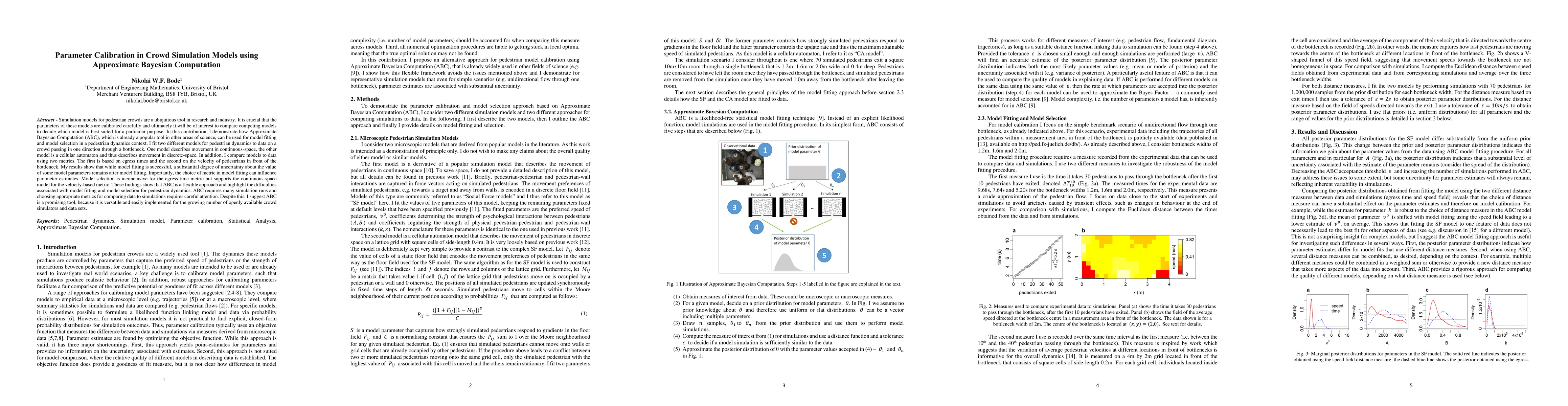 This paper demonstrates the use of Approximate Bayesian Computation (ABC) for calibrating parameters in pedestrian crowd simulation models, comparing continuous-space and cellular automaton models. While ABC successfully fits models, it reveals significant uncertainty in parameter estimates and highlights the impact of choice of metrics on model selection, favoring the continuous-space model for velocity-based metrics.