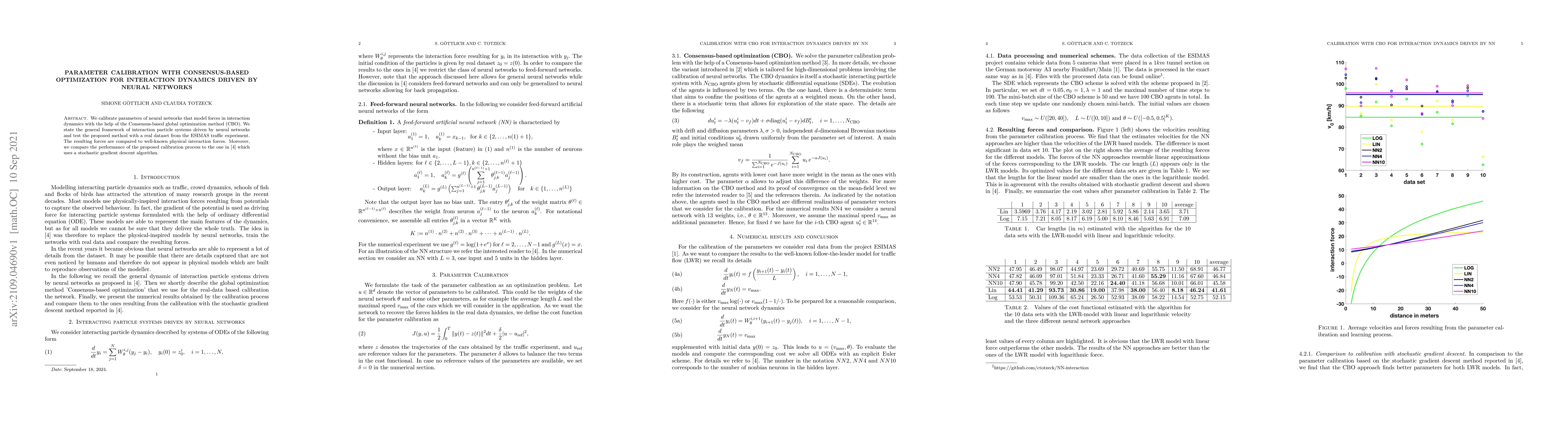 We calibrate parameters of neural networks that model forces in interaction dynamics with the help of the Consensus-based global optimization method (CBO). We state the general framework of interaction particle systems driven by neural networks and test the proposed method with a real dataset from the ESIMAS traffic experiment. The resulting forces are compared to well-known physical interaction forces. Moreover, we compare the performance of the proposed calibration process to the one in [4] which uses a stochastic gradient descent algorithm.