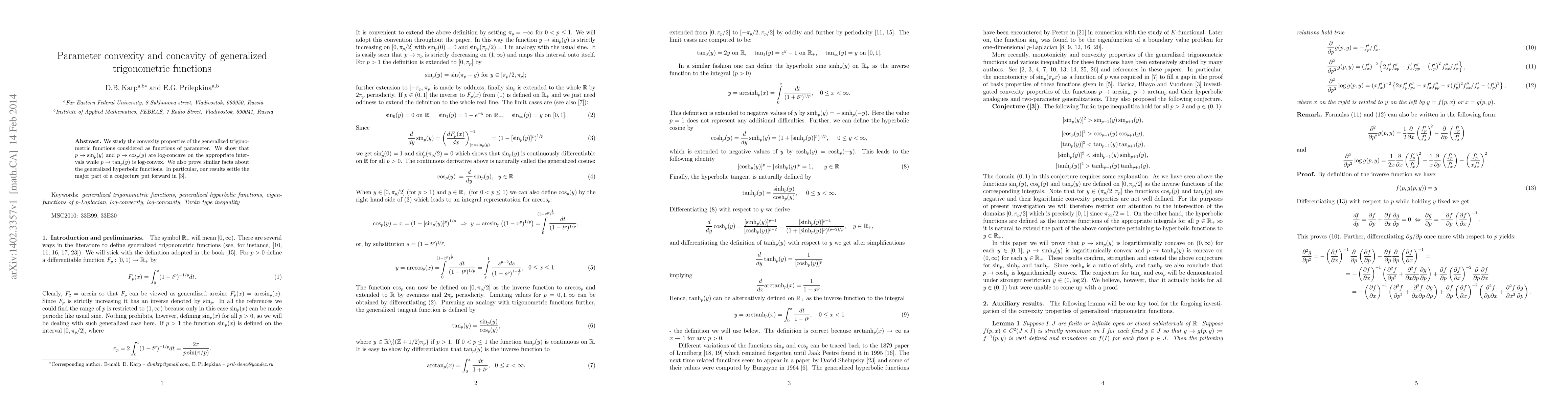 This paper investigates the convexity properties of generalized trigonometric functions, demonstrating that $p\to\sin_p(y)$ and $p\to\cos_p(y)$ are log-concave, while $p\to\tan_p(y)$ is log-convex, and extends these findings to generalized hyperbolic functions, resolving a significant conjecture from a prior study.
