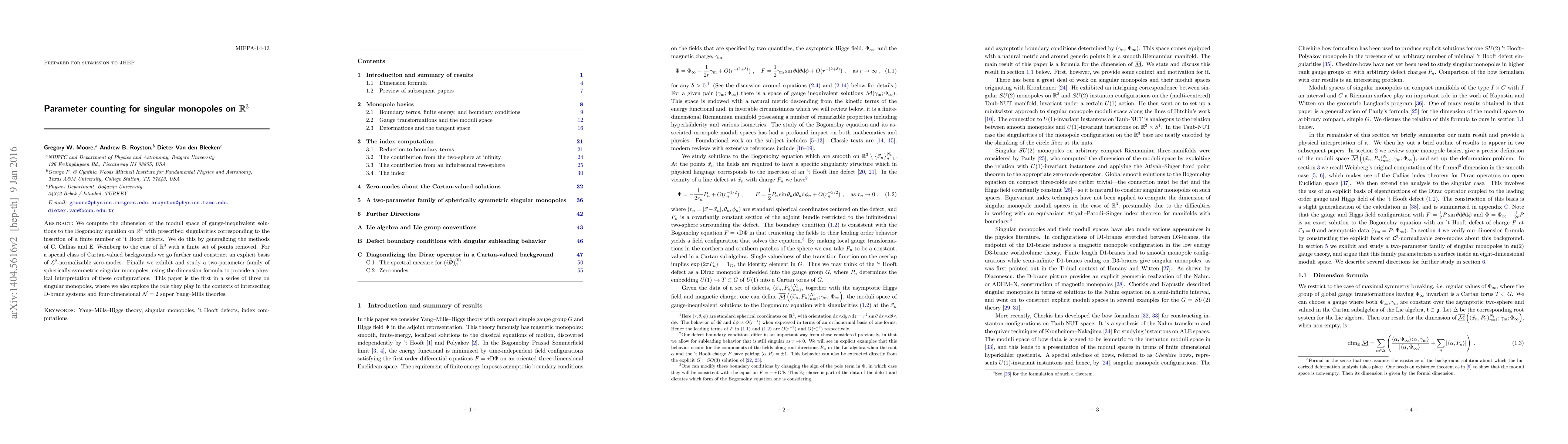 We compute the dimension of the moduli space of gauge-inequivalent solutions to the Bogomolny equation on R^3 with prescribed singularities corresponding to the insertion of a finite number of 't Hooft defects. We do this by generalizing the methods of C. Callias and E. Weinberg to the case of R^3 with a finite set of points removed. For a special class of Cartan-valued backgrounds we go further and construct an explicit basis of L^2-normalizable zero-modes. Finally we exhibit and study a two-parameter family of spherically symmetric singular monopoles, using the dimension formula to provide a physical interpretation of these configurations. This paper is the first in a series of three on singular monopoles, where we also explore the role they play in the contexts of intersecting D-brane systems and four-dimensional N=2 super Yang-Mills theories.