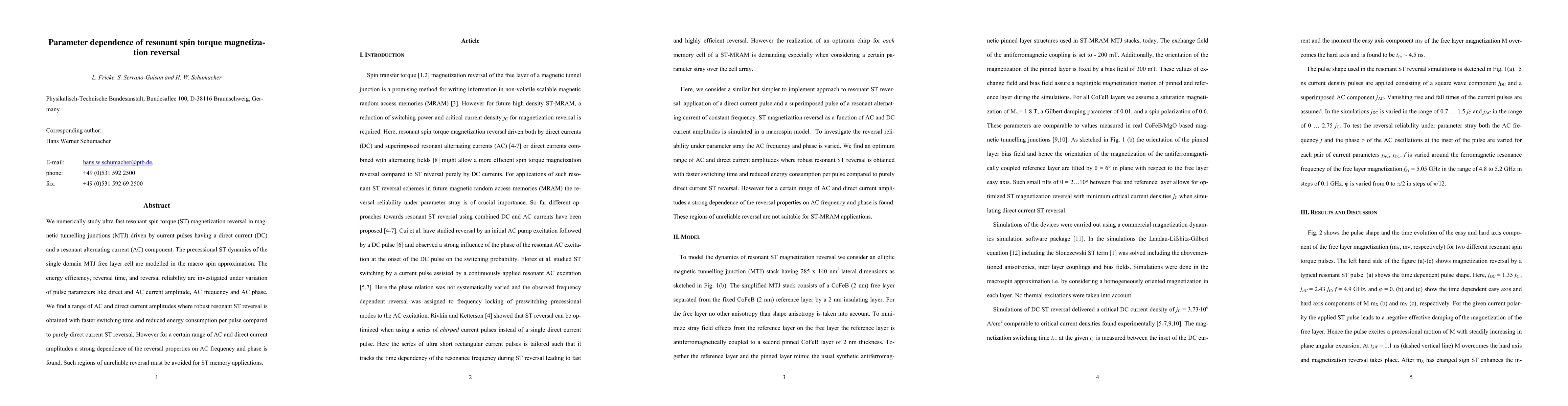 We numerically study ultra fast resonant spin torque (ST) magnetization reversal in magnetic tunnelling junctions (MTJ) driven by current pulses having a direct current (DC) and a resonant alternating current (AC) component. The precessional ST dynamics of the single domain MTJ free layer cell are modelled in the macro spin approximation. The energy efficiency, reversal time, and reversal reliability are investigated under variation of pulse parameters like direct and AC current amplitude, AC frequency and AC phase. We find a range of AC and direct current amplitudes where robust resonant ST reversal is obtained with faster switching time and reduced energy consumption per pulse compared to purely direct current ST reversal. However for a certain range of AC and direct current amplitudes a strong dependence of the reversal properties on AC frequency and phase is found. Such regions of unreliable reversal must be avoided for ST memory applications.