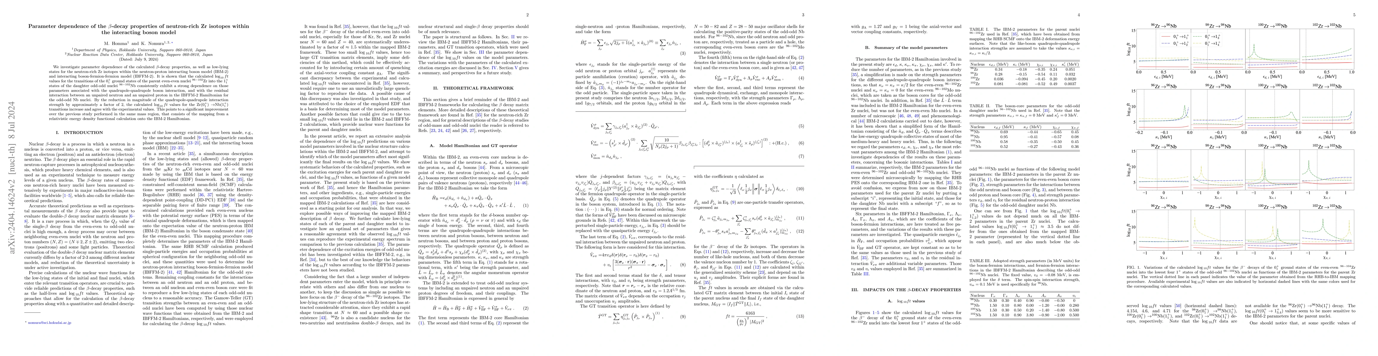 We investigate parameter dependence of the calculated $\beta$-decay properties, as well as low-lying states for the neutron-rich Zr isotopes within the neutron-proton interacting boson model (IBM-2) and interacting boson-fermion-fermion model (IBFFM-2). It is shown that the calculated $\log_{10}ft$ values for the transitions of the $0^+_1$ ground states of the parent even-even nuclei $^{96-102}$Zr into the $1^+_1$ states of the daughter odd-odd nuclei $^{96-102}$Nb consistently exhibit a strong dependence on those parameters associated with the quadrupole-quadrupole boson interaction, and with the residual interaction between an unpaired neutron and an unpaired proton in the IBFFM-2 Hamiltonian for the odd-odd Nb nuclei. By the reduction in magnitude of the quadrupole-quadrupole interaction strength by approximately a factor of 2, the calculated $\log_{10}ft$ values for the Zr$(0^+_1)\to$Nb$(1^+_1)$ transitions increase and agree with the experimental values. This points to a significant improvement over the previous study performed in the same mass region, that consists in the mapping from a relativistic energy density functional calculation onto the IBM-2 Hamiltonian.