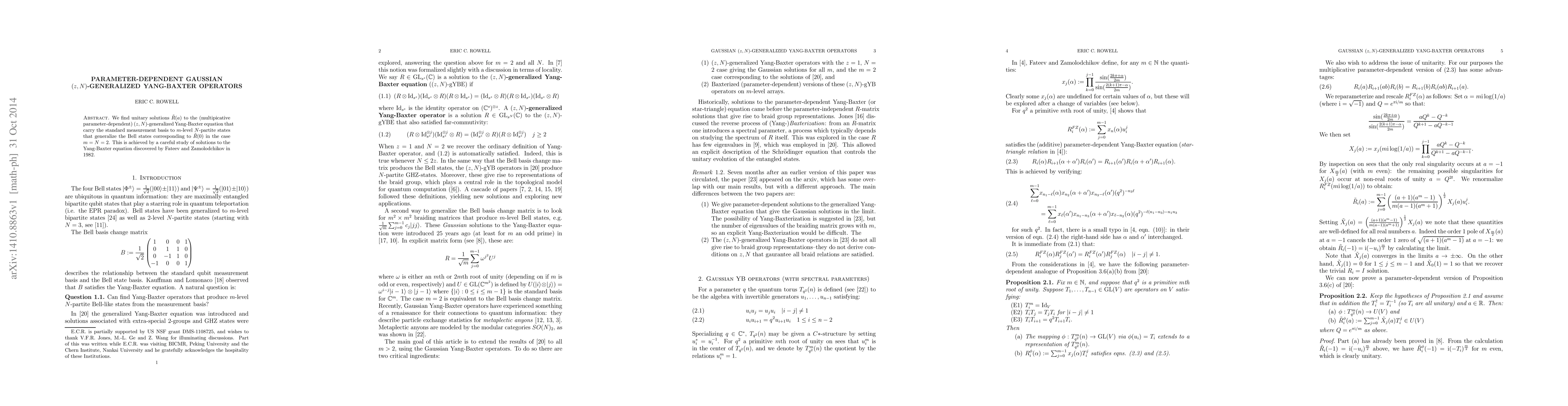 We find unitary solutions $\tilde{R}(a)$ to the (multipicative parameter-dependent) $(z,N)$-generalized Yang-Baxter equation that carry the standard measurement basis to $m$-level $N$-partite states that generalize the Bell states corresponding to $\tilde{R}(0)$ in the case $m=N=2$. This is achieved by a careful study of solutions to the Yang-Baxter equation discovered by Fateev and Zamolodchikov in 1982.