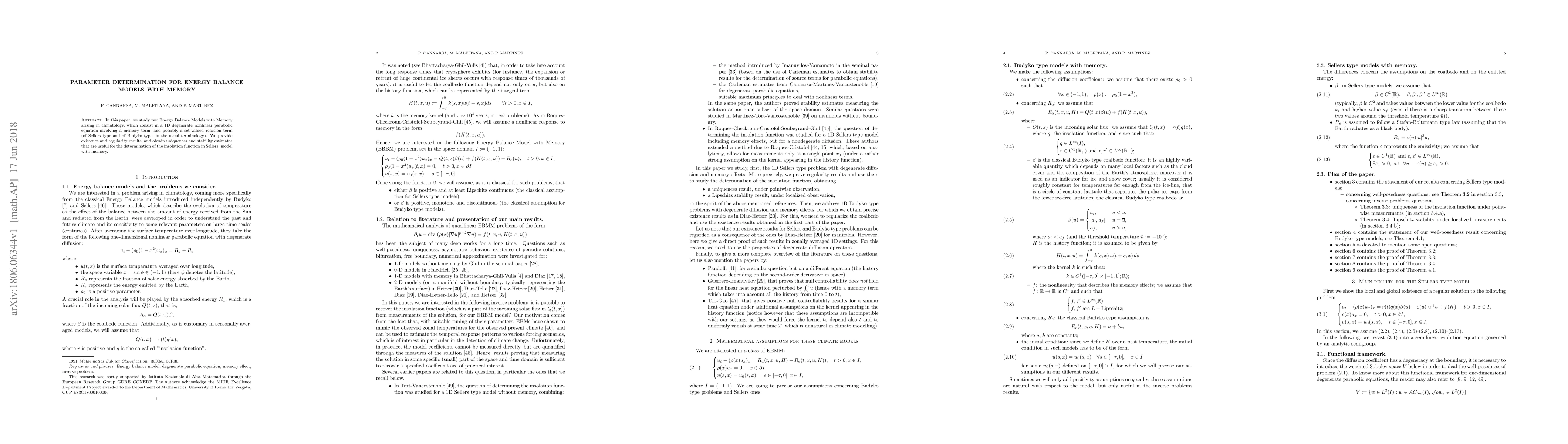 This paper investigates two Energy Balance Models with Memory used in climatology, focusing on the existence, regularity, uniqueness, and stability of solutions to a 1D degenerate nonlinear parabolic equation with memory terms. The findings provide essential insights for determining the insolation function in Sellers' model with memory.