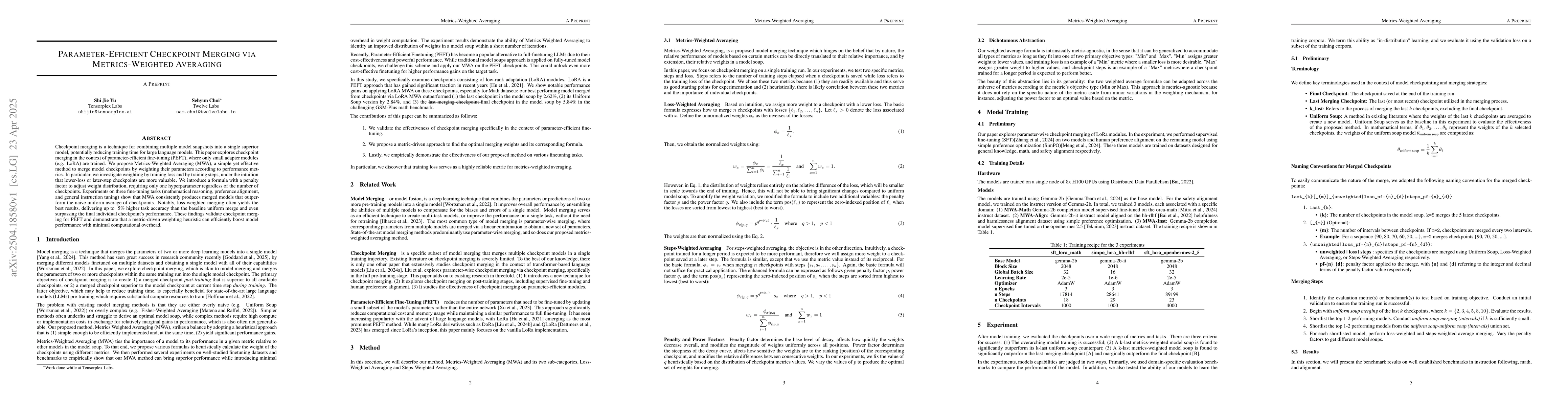 This research validates checkpoint merging for PEFT and demonstrates that a metric-driven weighting heuristic can efficiently enhance model performance with minimal computational overhead.