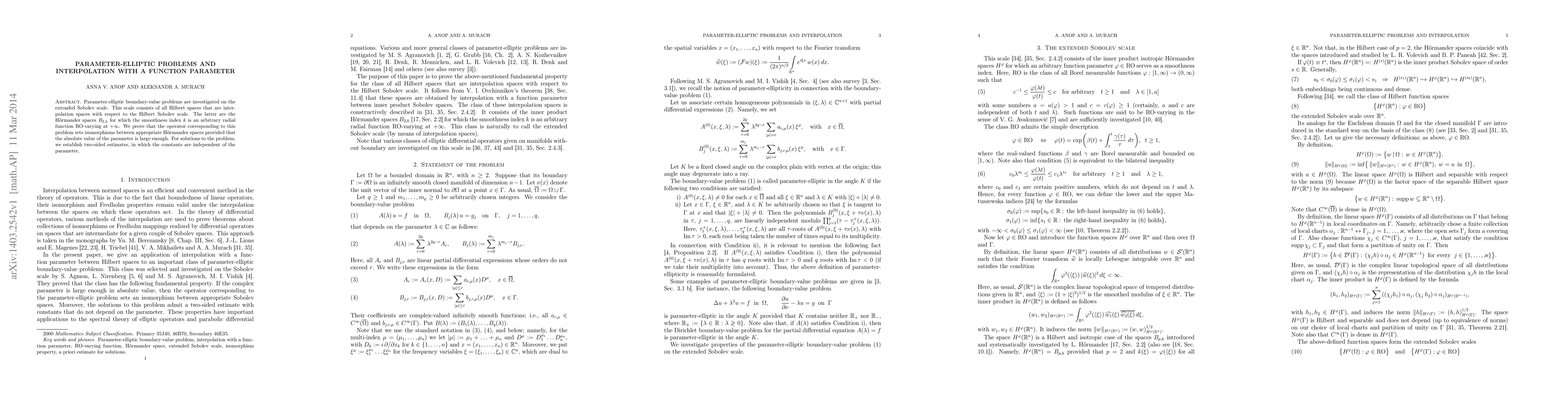 Parameter-elliptic boundary-value problems are investigated on the extended Sobolev scale. This scale consists of all Hilbert spaces that are interpolation spaces with respect to the Hilbert Sobolev scale. The latter are the H\"ormander spaces $B_{2,k}$ for which the smoothness index $k$ is an arbitrary radial function RO-varying at infinity. We prove that the operator corresponding to this problem sets isomorphisms between appropriate H\"ormander spaces provided that the absolute value of the parameter is large enough. For solutions to the problem, we establish two-sided estimates, in which the constants are independent of the parameter.