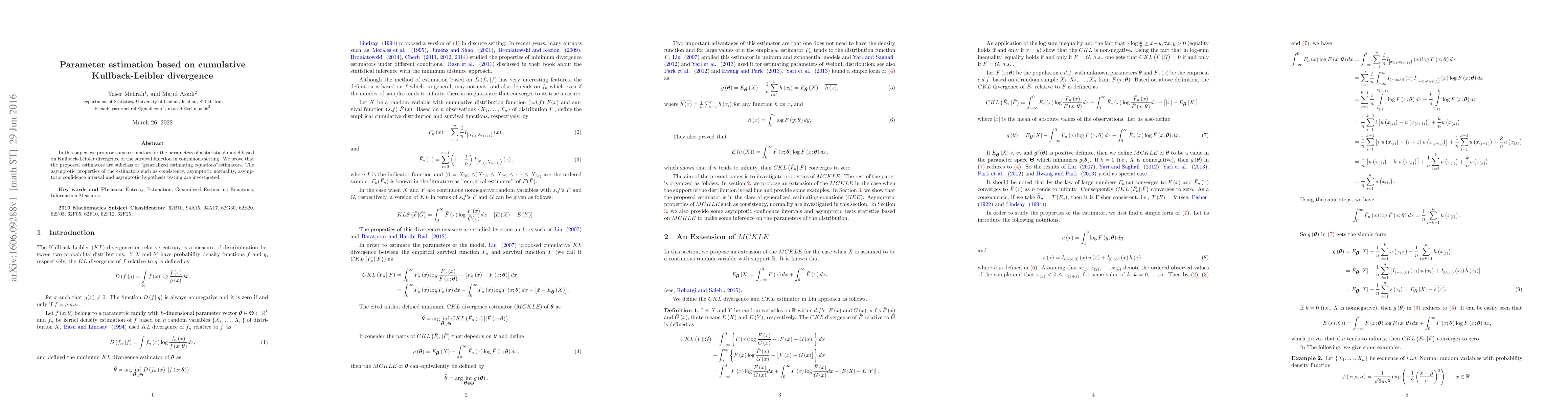 The paper proposes estimators for the parameters of a statistical model using cumulative Kullback-Leibler divergence in a continuous setting, proving these estimators are a subclass of 'generalized estimating equations' (GEE) estimators. It investigates the asymptotic properties of these estimators, including consistency, asymptotic normality, asymptotic confidence intervals, and hypothesis testing.