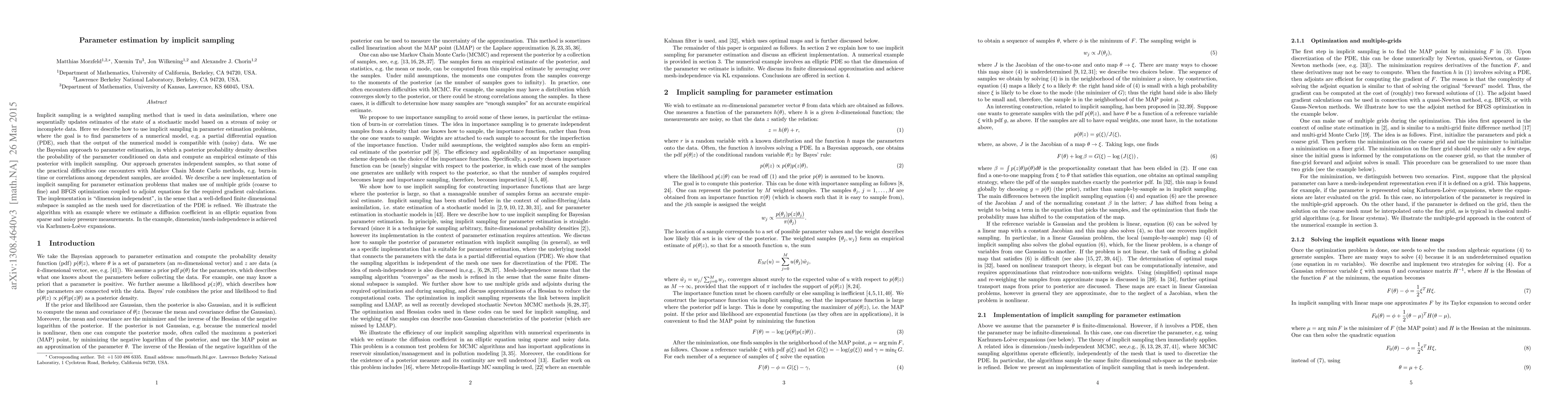 Implicit sampling is a weighted sampling method that is used in data assimilation, where one sequentially updates estimates of the state of a stochastic model based on a stream of noisy or incomplete data. Here we describe how to use implicit sampling in parameter estimation problems, where the goal is to find parameters of a numerical model, e.g.~a partial differential equation (PDE), such that the output of the numerical model is compatible with (noisy) data. We use the Bayesian approach to parameter estimation, in which a posterior probability density describes the probability of the parameter conditioned on data and compute an empirical estimate of this posterior with implicit sampling. Our approach generates independent samples, so that some of the practical difficulties one encounters with Markov Chain Monte Carlo methods, e.g.~burn-in time or correlations among dependent samples, are avoided. We describe a new implementation of implicit sampling for parameter estimation problems that makes use of multiple grids (coarse to fine) and BFGS optimization coupled to adjoint equations for the required gradient calculations. The implementation is "dimension independent", in the sense that a well-defined finite dimensional subspace is sampled as the mesh used for discretization of the PDE is refined. We illustrate the algorithm with an example where we estimate a diffusion coefficient in an elliptic equation from sparse and noisy pressure measurements. In the example, dimension\slash mesh-independence is achieved via Karhunen-Lo\`{e}ve expansions.