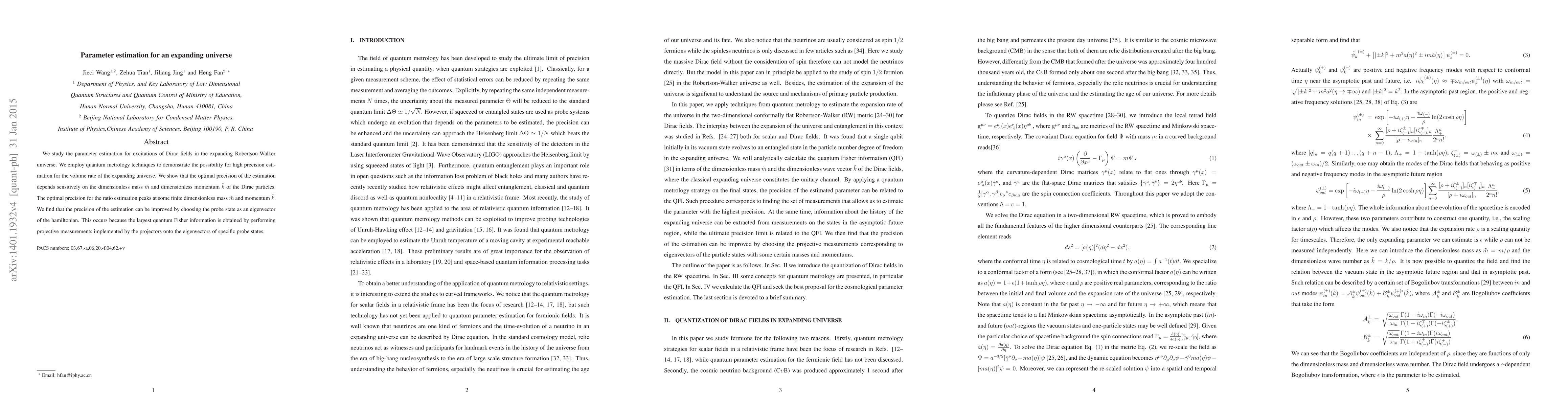 This paper investigates parameter estimation for Dirac field excitations in an expanding Robertson-Walker universe, employing quantum metrology to achieve high precision estimation of the universe's volume rate. The optimal estimation precision is found to depend on the Dirac particles' dimensionless mass and momentum, peaking at specific values, and can be enhanced by using probe states as eigenvectors of the Hamiltonian.