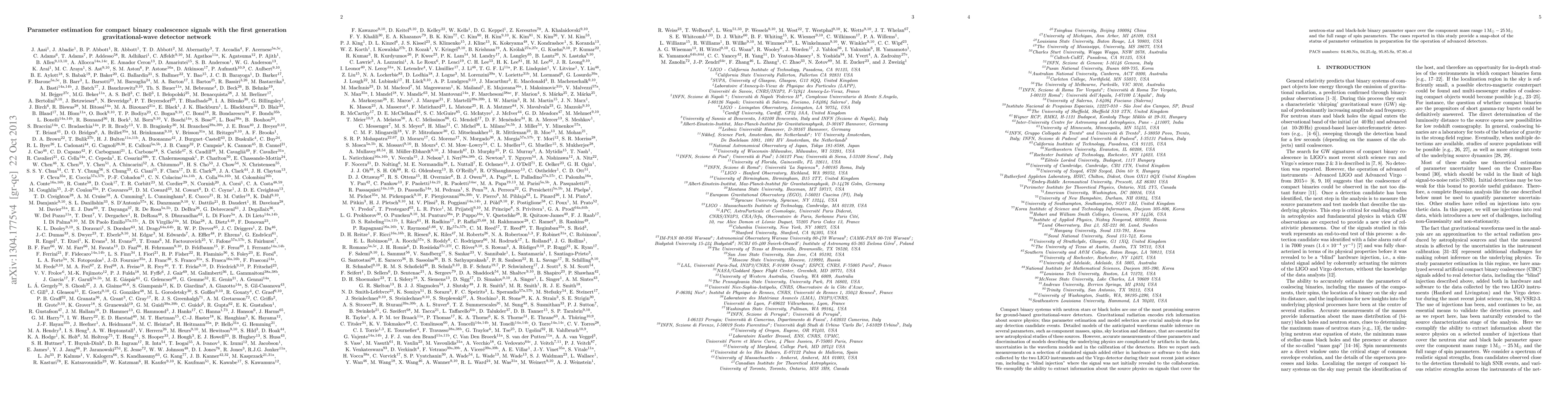 This paper investigates the parameter estimation for compact binary coalescence signals using data from the first-generation gravitational-wave detectors LIGO and Virgo. It demonstrates the extraction of source physics parameters from simulated signals, highlighting the challenges and current capabilities in preparation for future advanced detectors.