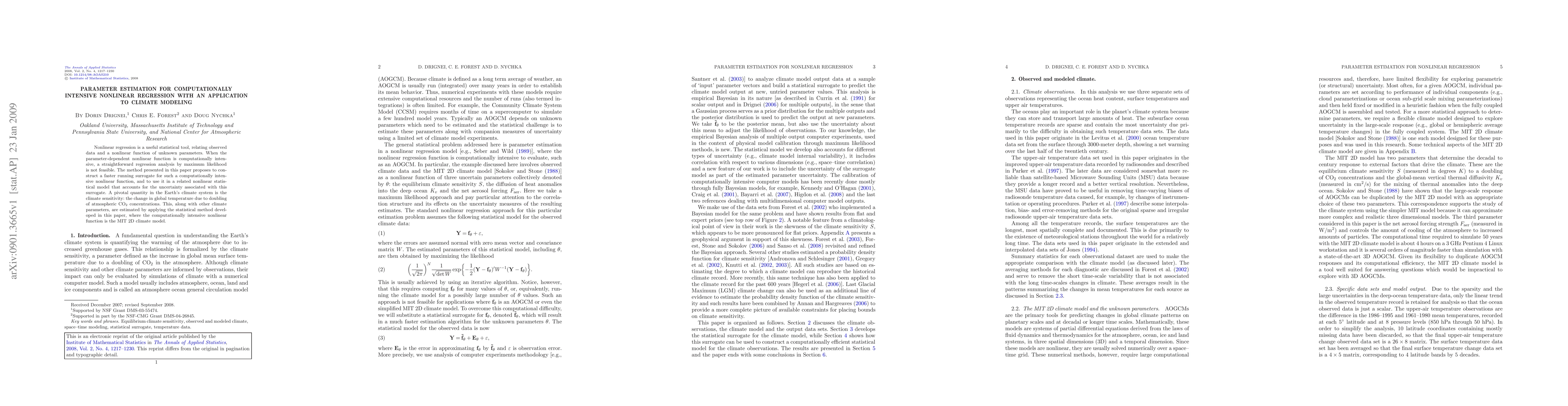 This paper proposes a method for estimating parameters in computationally intensive nonlinear regression, using a surrogate model to speed up analysis. The method is applied to climate modeling to estimate parameters like climate sensitivity, utilizing the MIT 2D climate model as the computationally demanding function.