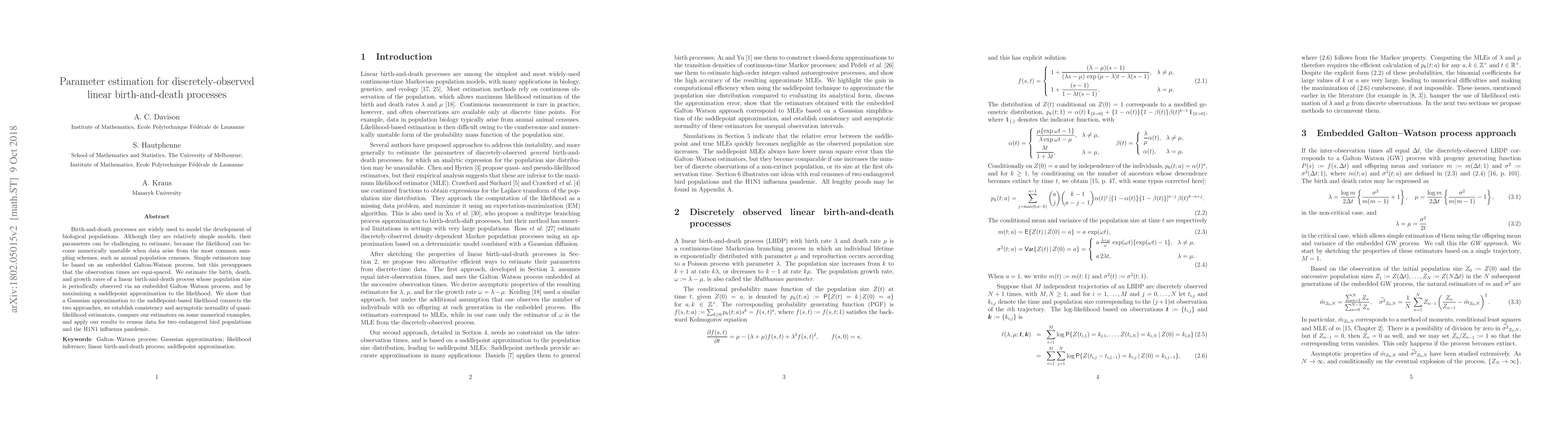 This paper presents a method for estimating parameters in linear birth-and-death processes with discrete observations, using a saddlepoint approximation to the likelihood and establishing consistency and asymptotic normality of quasi-likelihood estimators.
