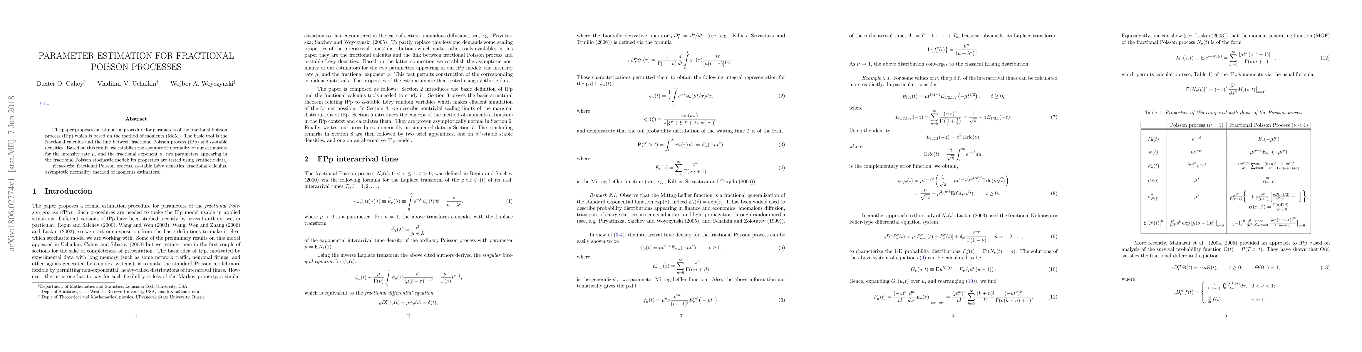 The paper proposes a formal estimation procedure for parameters of the fractional Poisson process (fPp). Such procedures are needed to make the fPp model usable in applied situations. The basic idea of fPp, motivated by experimental data with long memory is to make the standard Poisson model more flexible by permitting non-exponential, heavy-tailed distributions of interarrival times and different scaling properties. We establish the asymptotic normality of our estimators for the two parameters appearing in our fPp model. This fact permits construction of the corresponding confidence intervals. The properties of the estimators are then tested using simulated data.