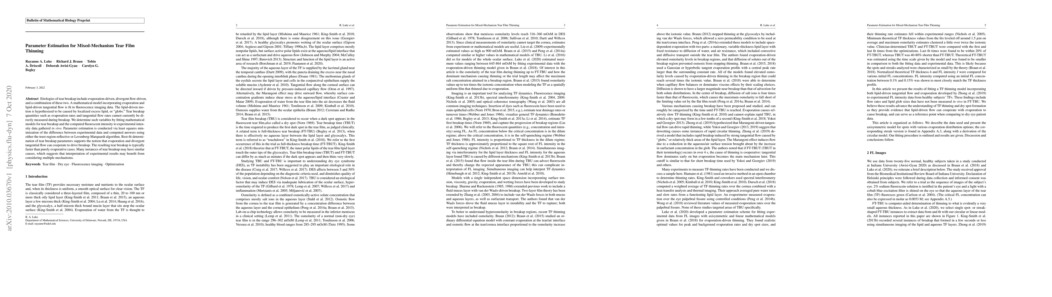 Etiologies of tear breakup include evaporation-driven, divergent flow-driven, and a combination of these two. A mathematical model incorporating evaporation and lipid-driven tangential flow is fit to fluorescence imaging data. The lipid-driven motion is hypothesized to be caused by localized excess lipid, or "globs." Tear breakup quantities such as evaporation rates and tangential flow rates cannot currently be directly measured during breakup. We determine such variables by fitting mathematical models for tear breakup and the computed fluorescent intensity to experimental intensity data gathered in vivo. Parameter estimation is conducted via least squares minimization of the difference between experimental data and computed answers using either the trust-region-reflective or Levenberg-Marquardt algorithm. Best-fit determination of tear breakup parameters supports the notion that evaporation and divergent tangential flow can cooperate to drive breakup. The resulting tear breakup is typically faster than purely evaporative cases. Many instances of tear breakup may have similar causes, which suggests that interpretation of experimental results may benefit from considering multiple mechanisms.