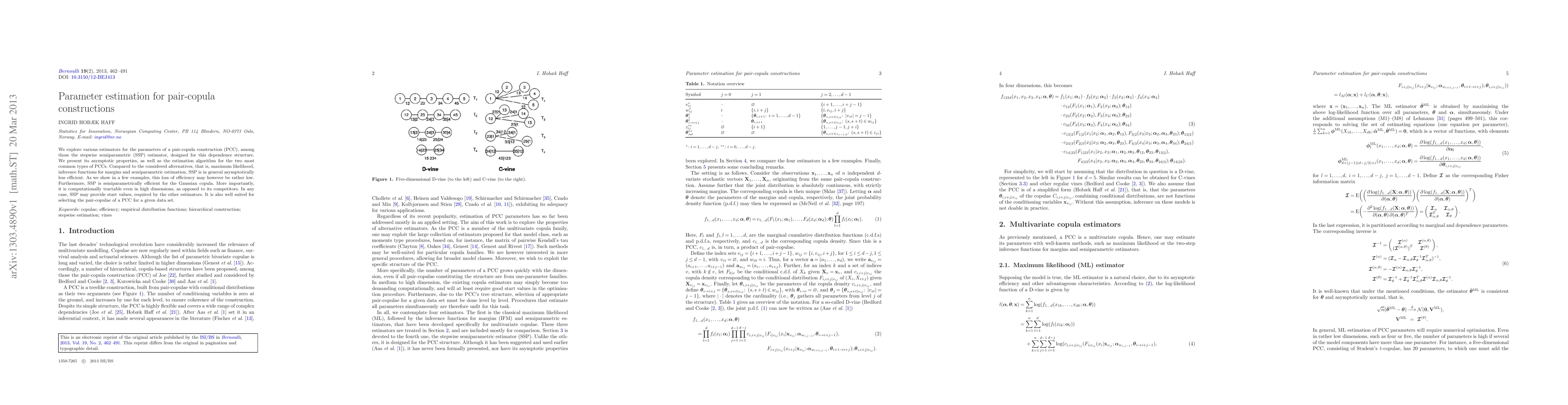This paper investigates estimators for the parameters of pair-copula constructions, focusing on the stepwise semiparametric (SSP) estimator. While SSP is less efficient than alternatives like maximum likelihood, it is computationally feasible and semiparametrically efficient for the Gaussian copula, making it useful for high-dimensional data and as a starting point for other estimators.