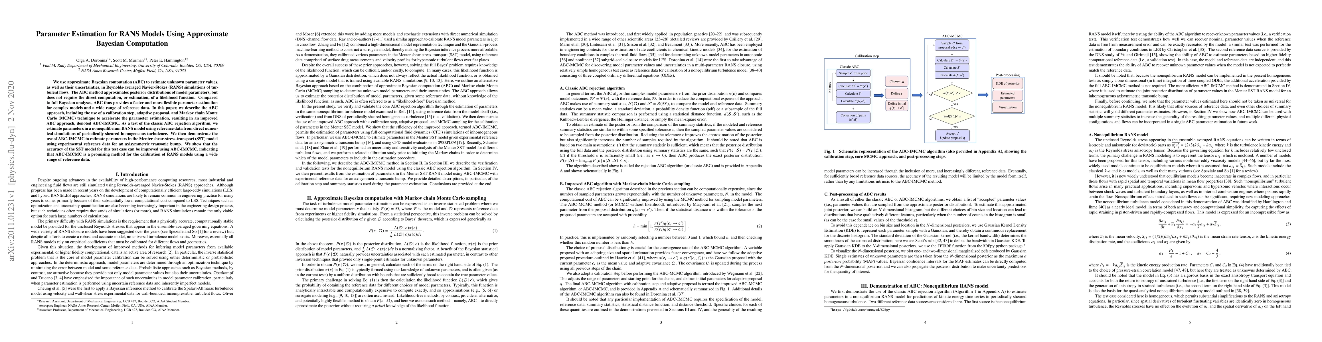 This paper proposes an improved approximate Bayesian computation (ABC-IMCMC) method for estimating parameters and their uncertainties in Reynolds-averaged Navier-Stokes (RANS) models for turbulent flows. The method, which does not require direct likelihood computation, demonstrates improved accuracy in calibrating both a nonequilibrium RANS model and the Menter shear-stress-transport model using reference data from simulations and experiments.